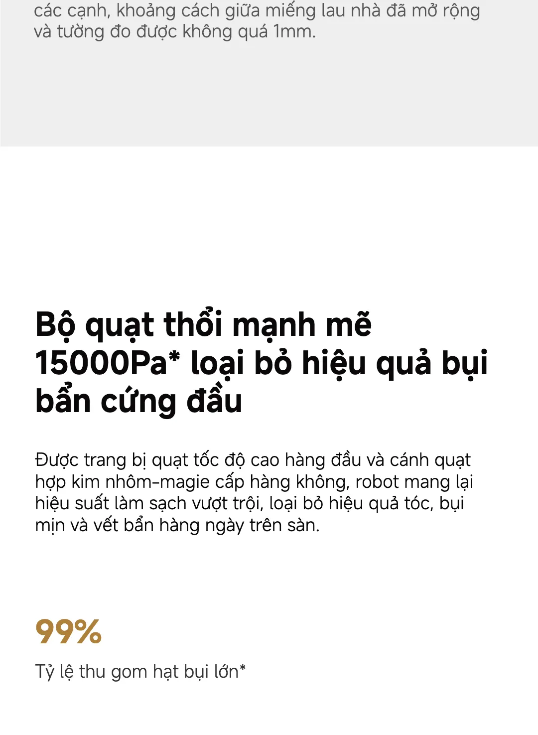 - Bộ quạt thổi mạnh 15000Pa để hút hiệu quả các hạt bụi lớn.