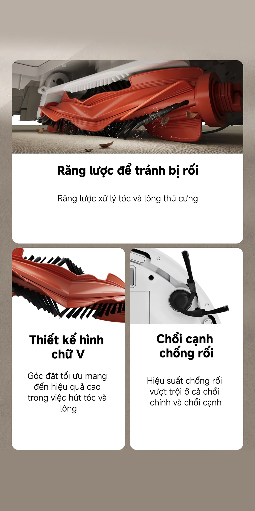 - Công nghệ chống rối đa chiều: Giảm tối thiểu tình trạng rối chổi, giúp duy trì hiệu suất hút lâu dài.
