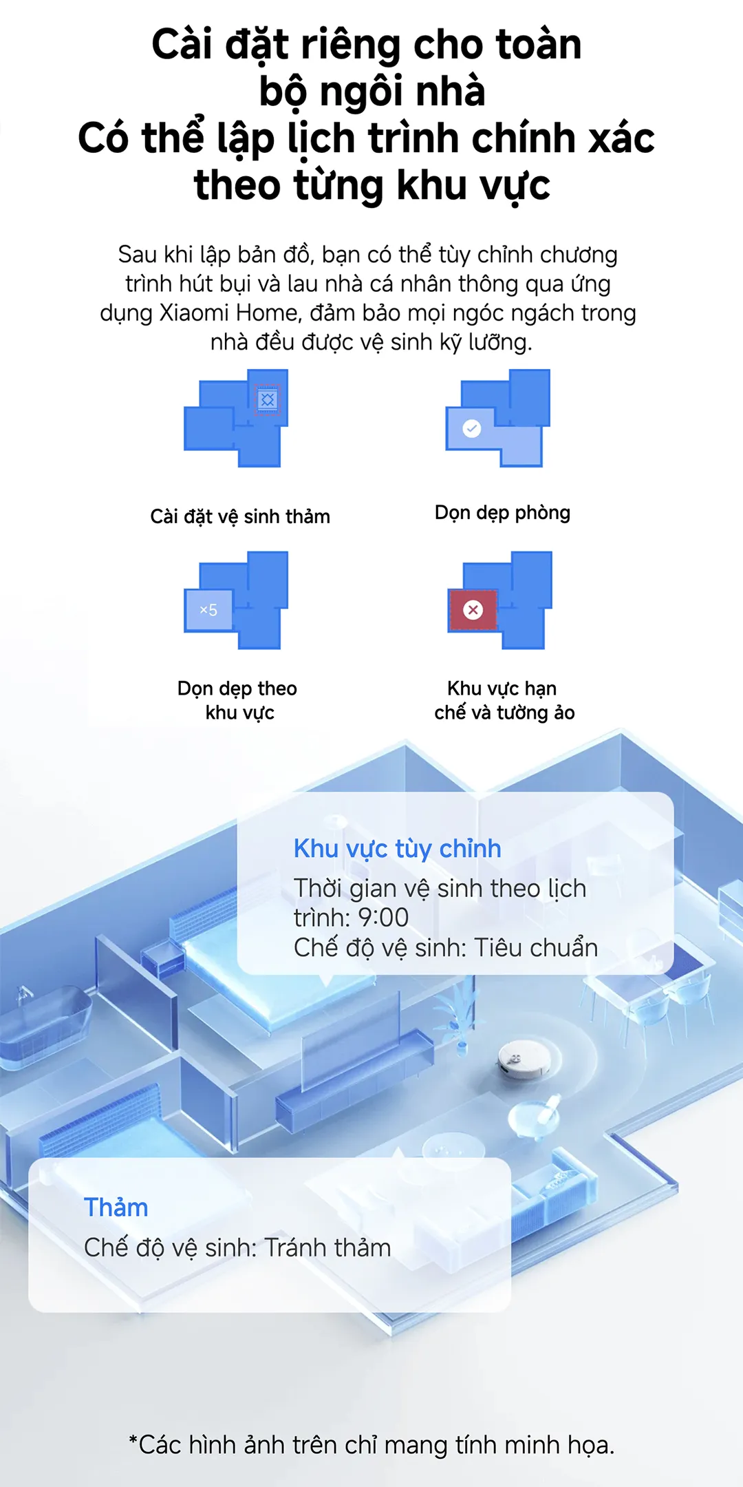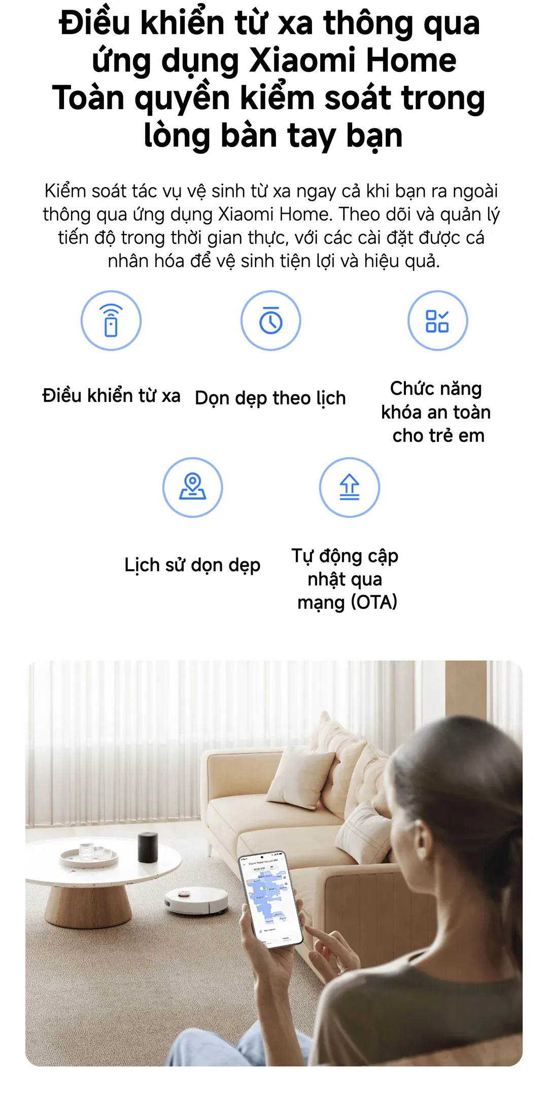 - Điều khiển từ xa thông qua ứng dụng Xiaomi Home: Lập lịch, tùy chỉnh chế độ, theo dõi tiến trình ngay trên điện thoại.