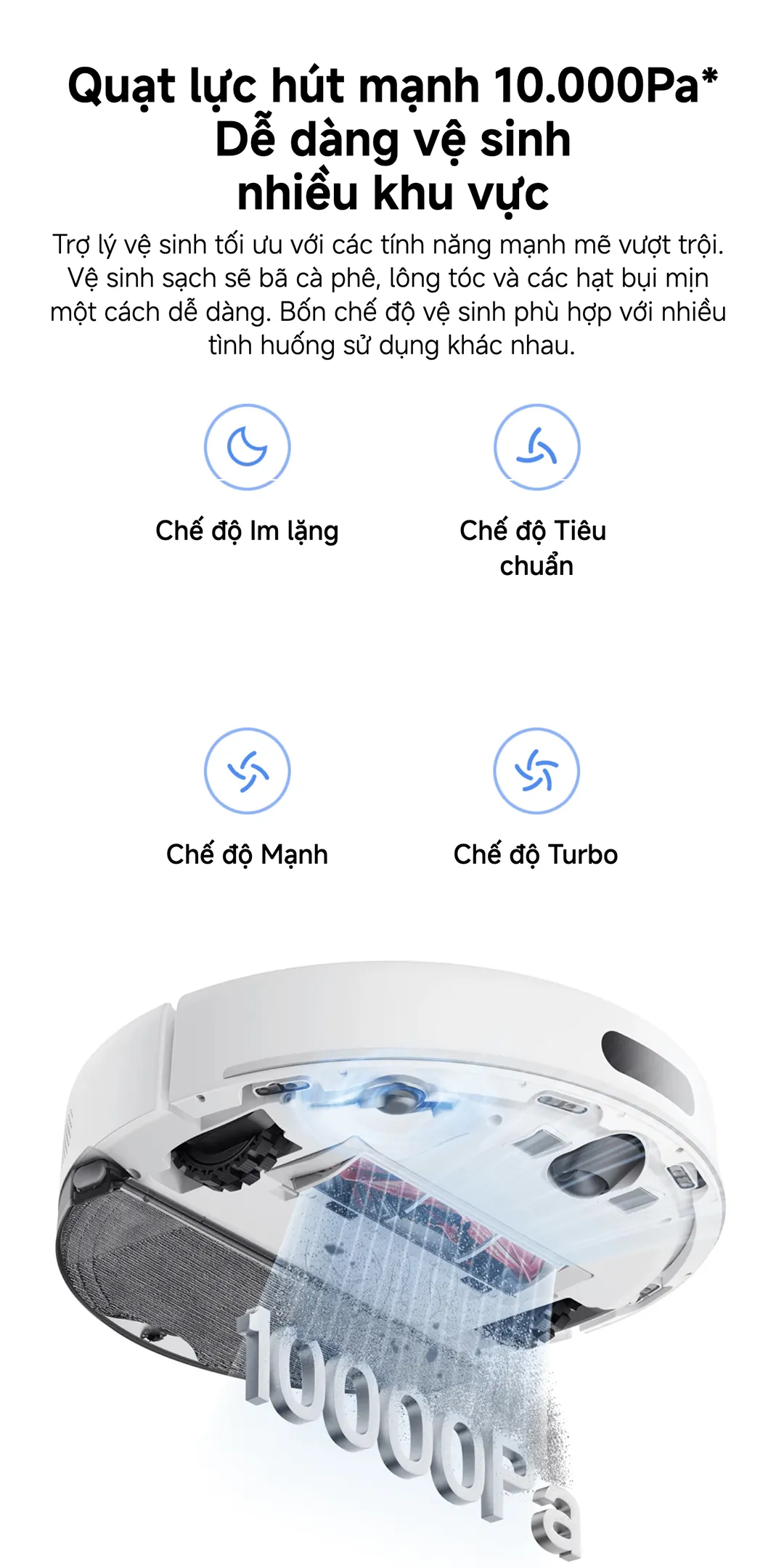 - Chế độ Turbo (lực hút lên tới 10.000Pa): Loại bỏ hiệu quả cả cặn bẩn và lông thú cưng.