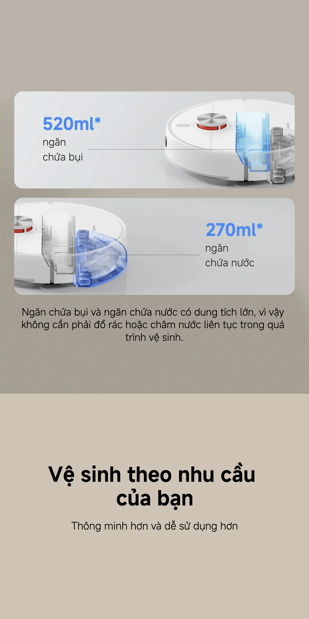 | Phù hợp với | Nhà có sàn gạch/ gỗ + cần hút bụi sâu mạnh | Gia đình nhỏ-vừa, hiệu quả hút-lau tốt | Nhà rộng hơn chút, nhiều khu vực cần dọn dẹp lâu |