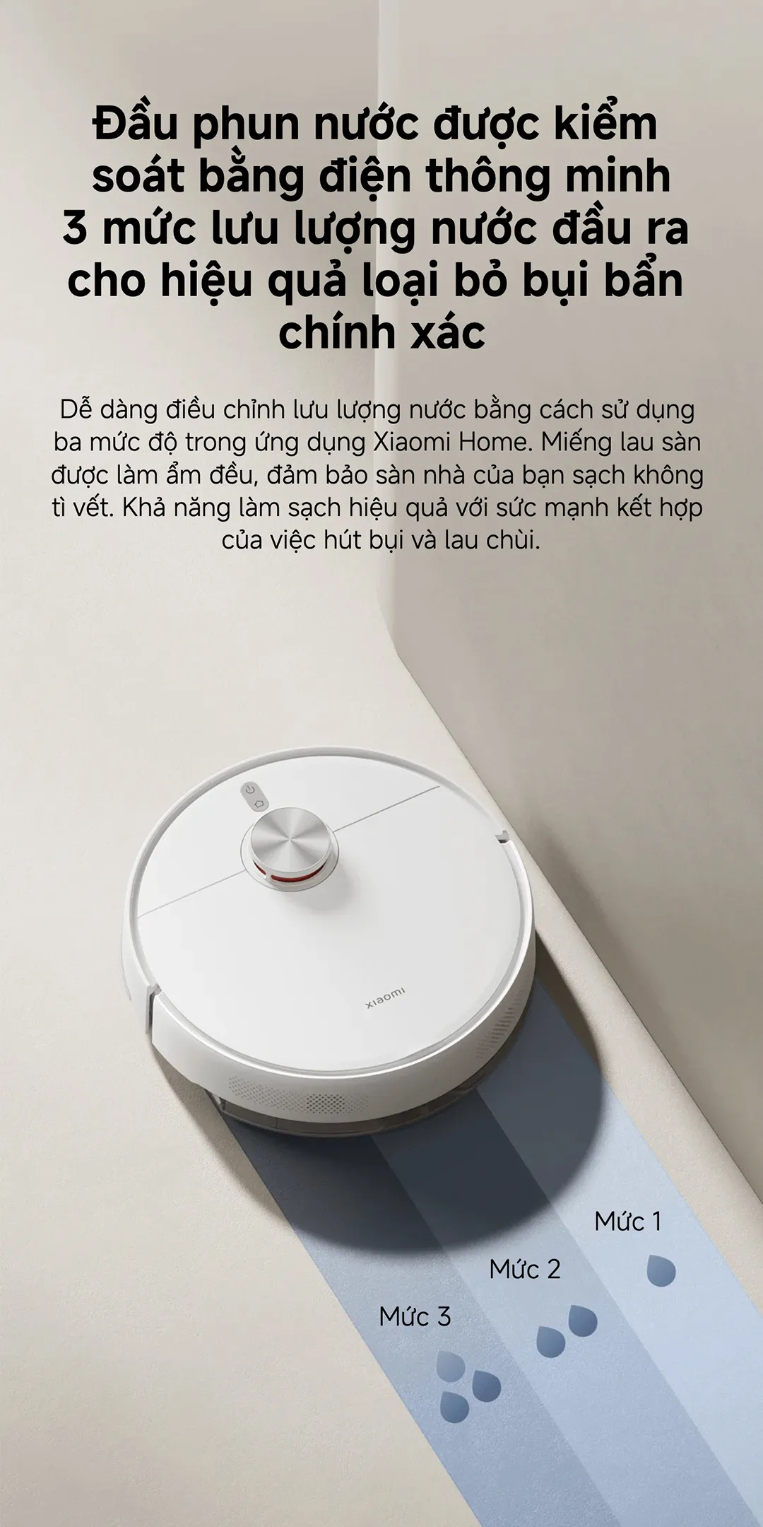 - Chế độ lau nhà tích hợp: Đầu phun nước được điều chỉnh 3 mức lưu lượng để làm sạch hiệu quả mà không để lại vết bẩn.