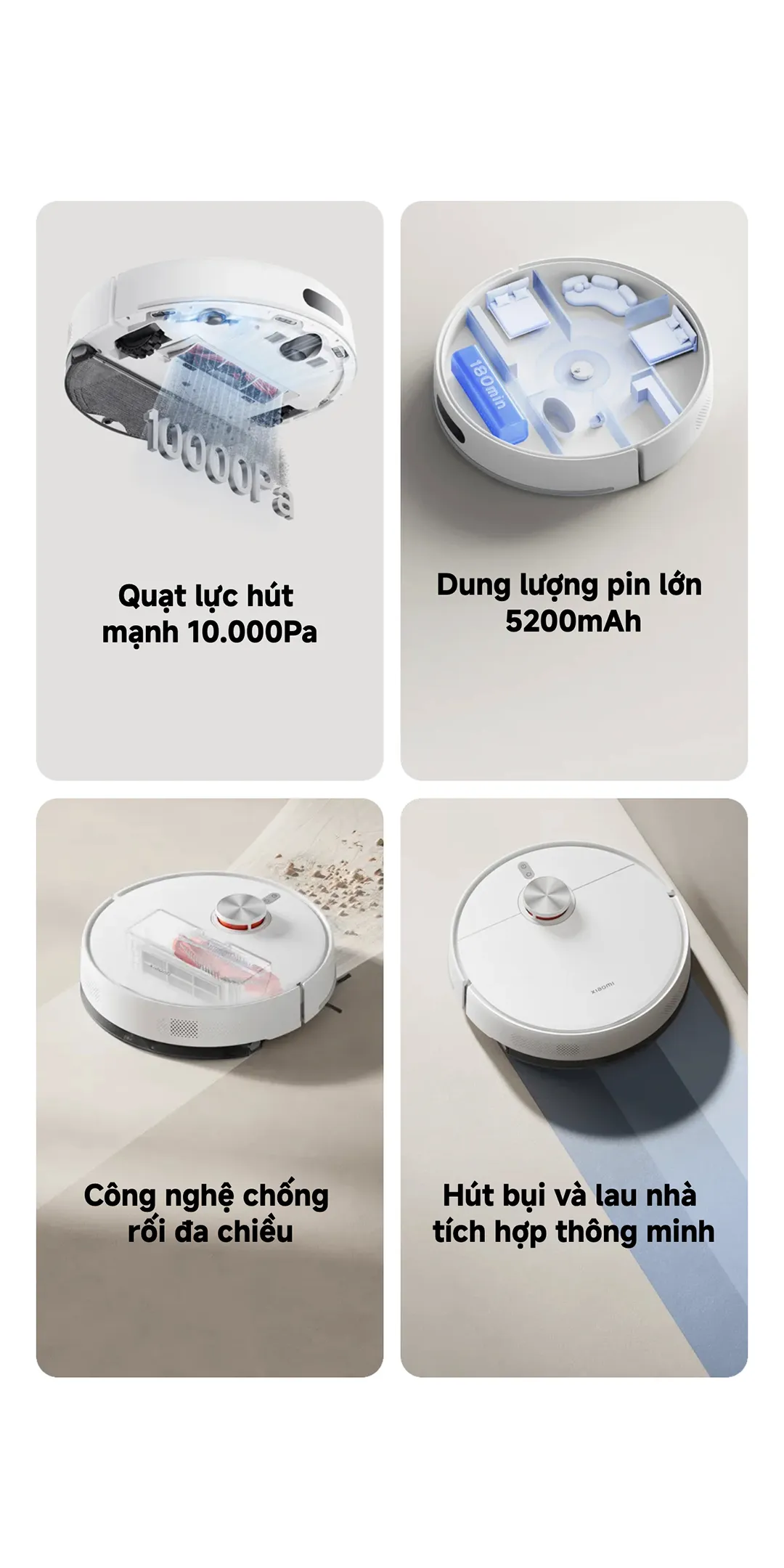 - Quạt lực hút mạnh 10.000Pa: Khả năng hút bụi vượt trội, đặc biệt là tóc và lông thú cưng.
