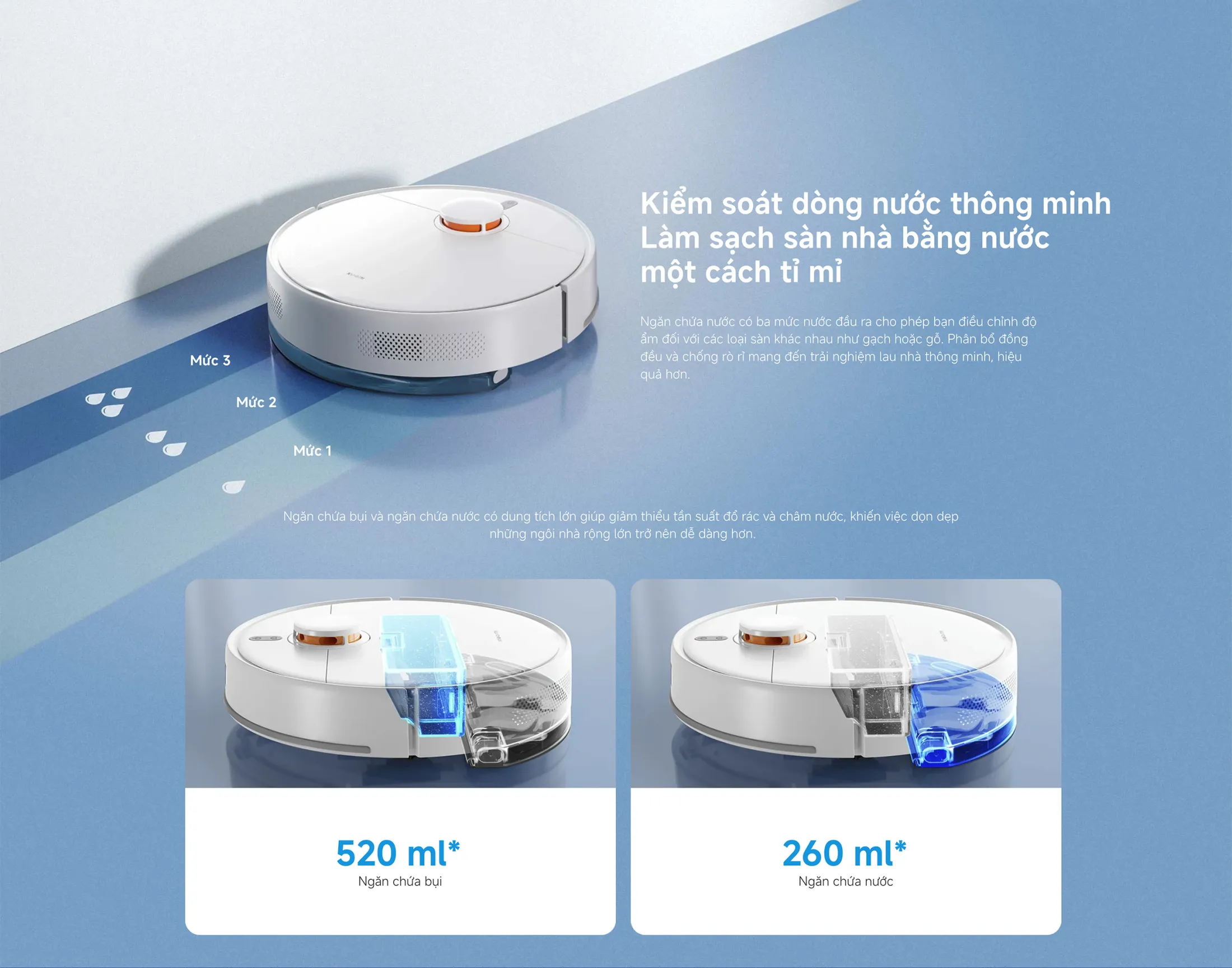 Robot Xiaomi S40C Hút Mạnh sở hữu ngăn chứa nước 260 ml và ngăn chứa bụi 520 ml. Lợi ích: