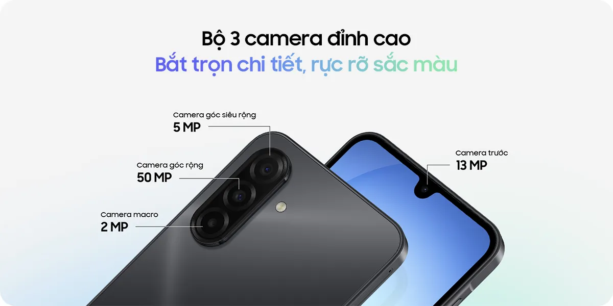 Samsung Galaxy A17 được trang bị bộ camera sau ba lăng kính: Camera góc rộng 50 MP với OIS, Camera góc siêu rộng 5 MP và Camera macro 2 MP. Tất cả đều hỗ trợ chụp ảnh trong điều kiện ánh sáng thấp nhờ công nghệ chống rung quang học (OIS).