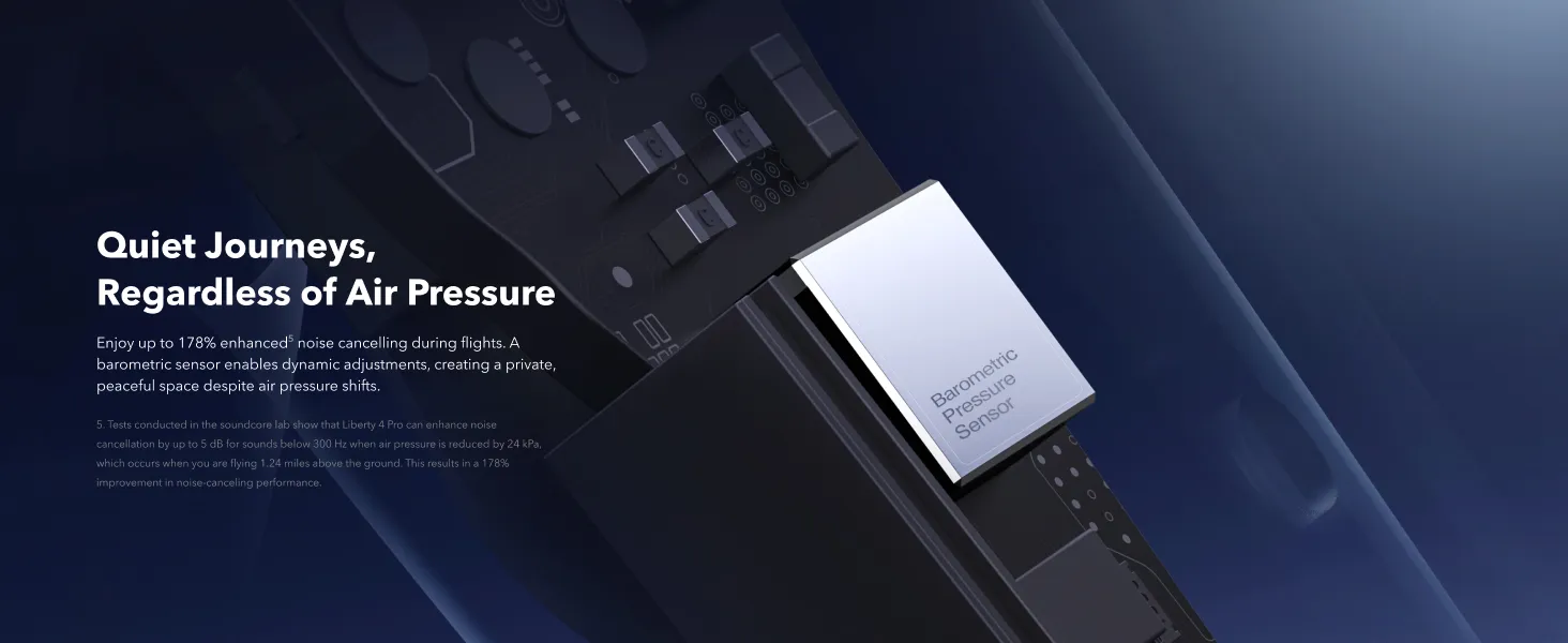 - Khả năng chống áp suất: Khi bay lên cao, áp suất giảm ~24 kPa – Soundcore Liberty 4 Pro tăng cường độ hủy tiếng ồn lên tới 178% so với khi trên mặt đất.