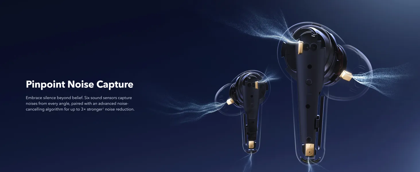 Điểm mạnh thực sự của Soundcore Liberty 4 Pro nằm ở hệ thống hủy tiếng ồn đa cảm biến. Với 7 cảm biến – bao gồm 6 cảm biến âm thanh và 1 cảm biến áp suất khí quyển, tai nghe có thể “nghe” tiếng ồn từ mọi góc độ và thực hiện điều chỉnh trong thời gian thực mỗi 0,3 giây.
