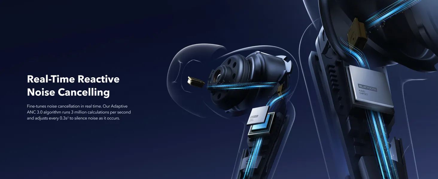 - Điều chỉnh tự động theo môi trường: Nhờ thuật toán Adaptive ANC 3.0, các tín hiệu hủy tiếng được tính toán và điều chỉnh liên tục, mang lại sự yên tĩnh mượt mà nhất.