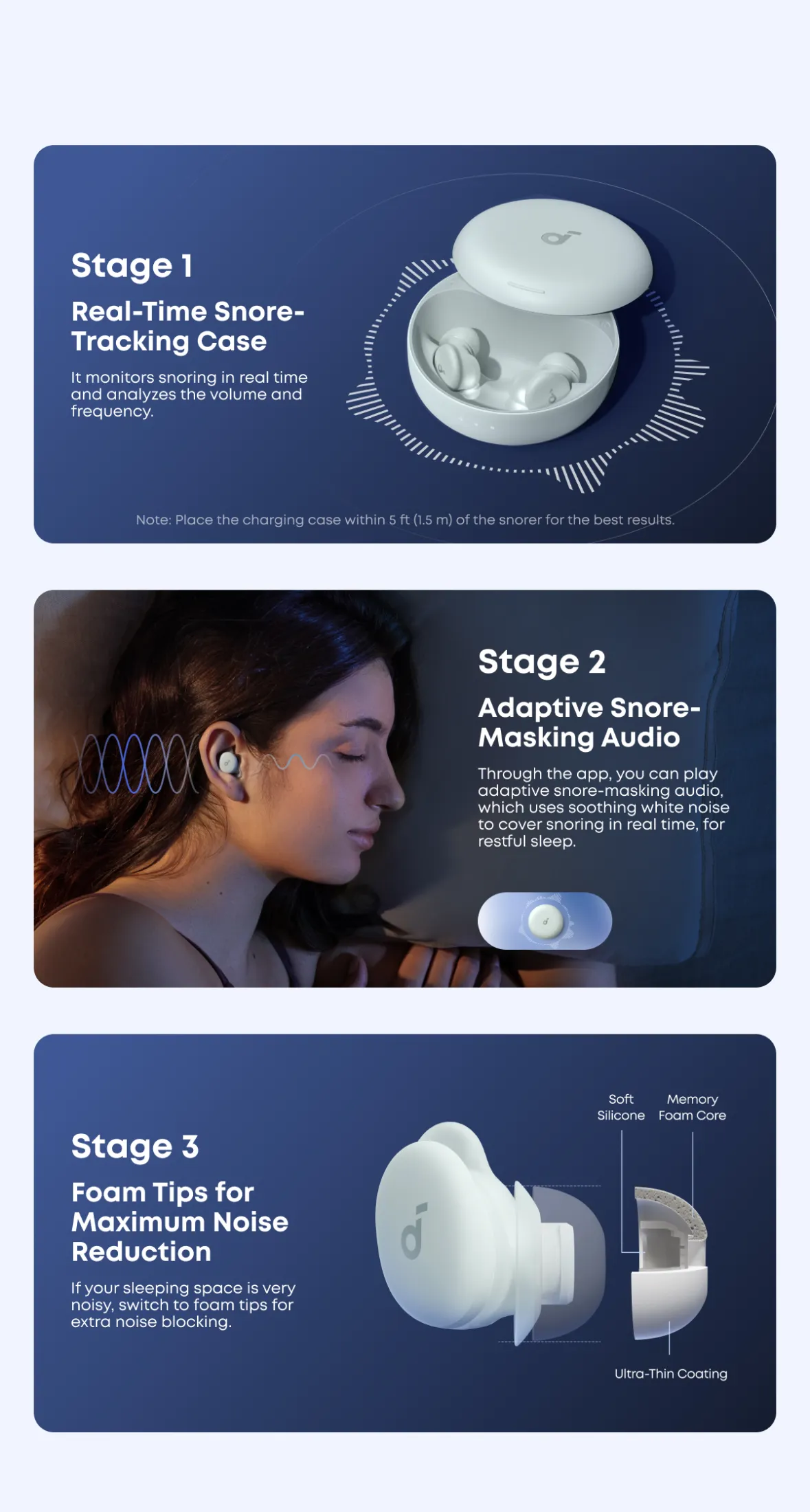 Snore Masking là một trong những tính năng độc đáo nhất mà Soundcore Sleep A30 mang lại. Hệ thống này hoạt động qua ba giai đoạn: