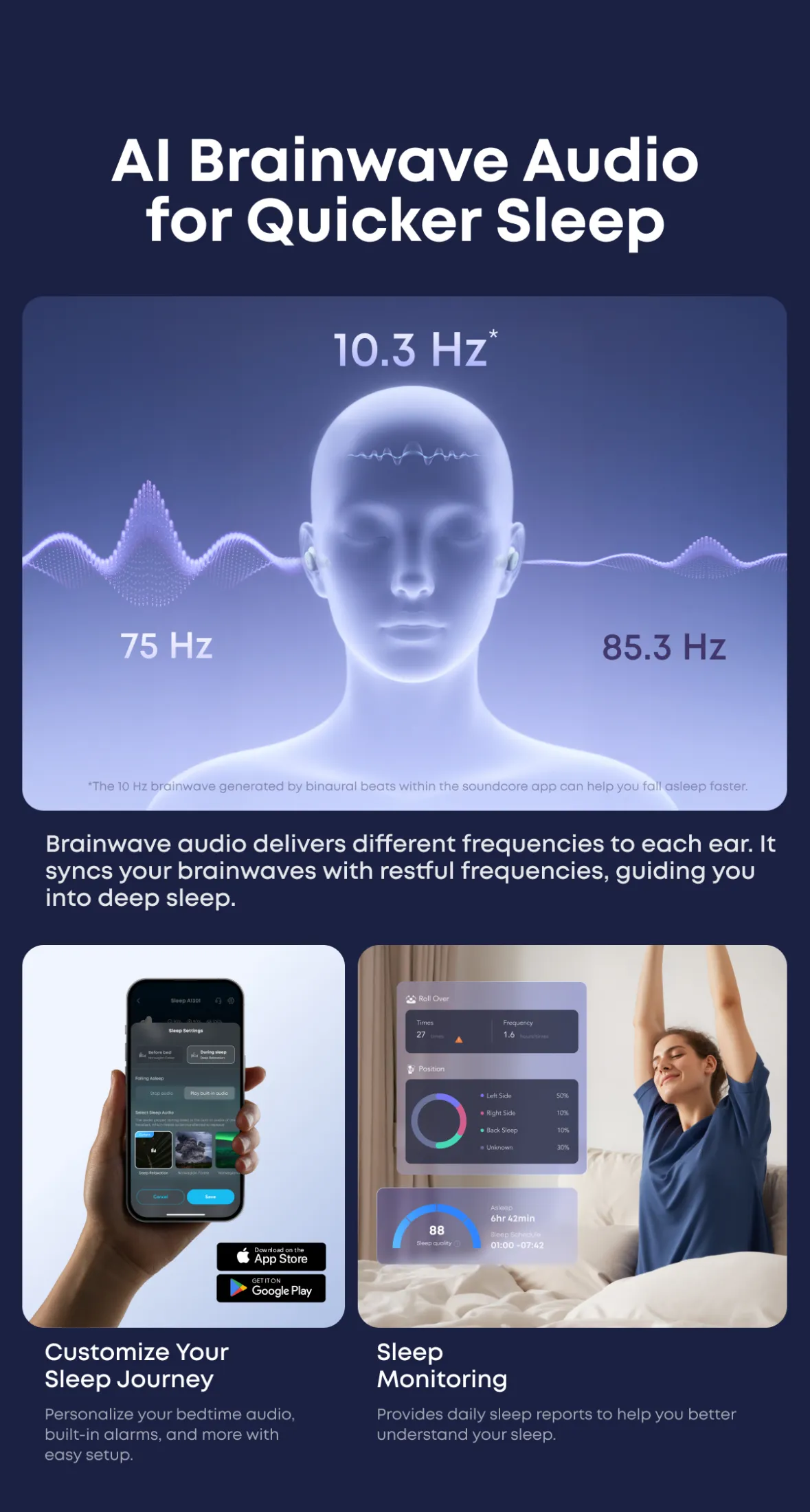 Để giúp bạn nhanh chóng chìm vào giấc ngủ, Soundcore Sleep A30 tích hợp Binaural Beats. Bằng cách phát ra tần số khác nhau cho mỗi tai, âm thanh này đồng bộ hóa nhịp điệu não với các giai đoạn thư giãn. Thông tin khoa học chỉ ra rằng tần số 10 Hz (Alpha) giúp tăng khả năng thư giãn và giảm thời gian cần để ngủ.