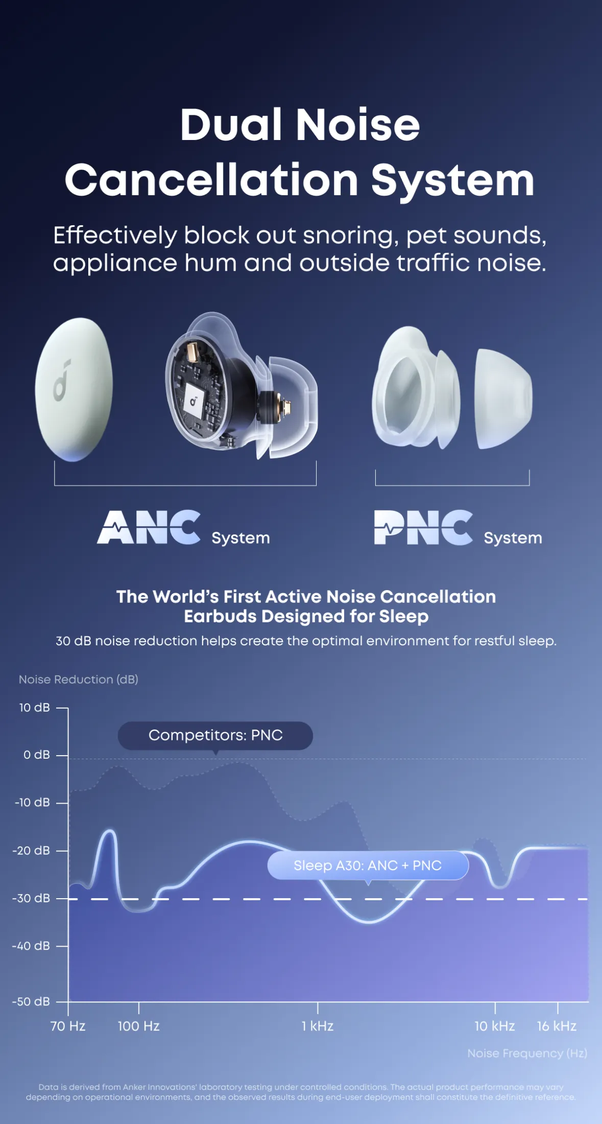 Active Noise Cancellation (ANC) trong Soundcore Sleep A30 sử dụng công nghệ Smart ANC với Ear Canal Adaptation Tech. Khi bạn đặt tai nghe vào, cảm biến nhận diện hình dạng ống tai của mình và điều chỉnh mức giảm tiếng ồn tối ưu. Nhờ vậy, âm thanh như gầm gừ xe cộ hay tiếng ngáy của người thân bị chặn lại hiệu quả lên tới 30 dB.