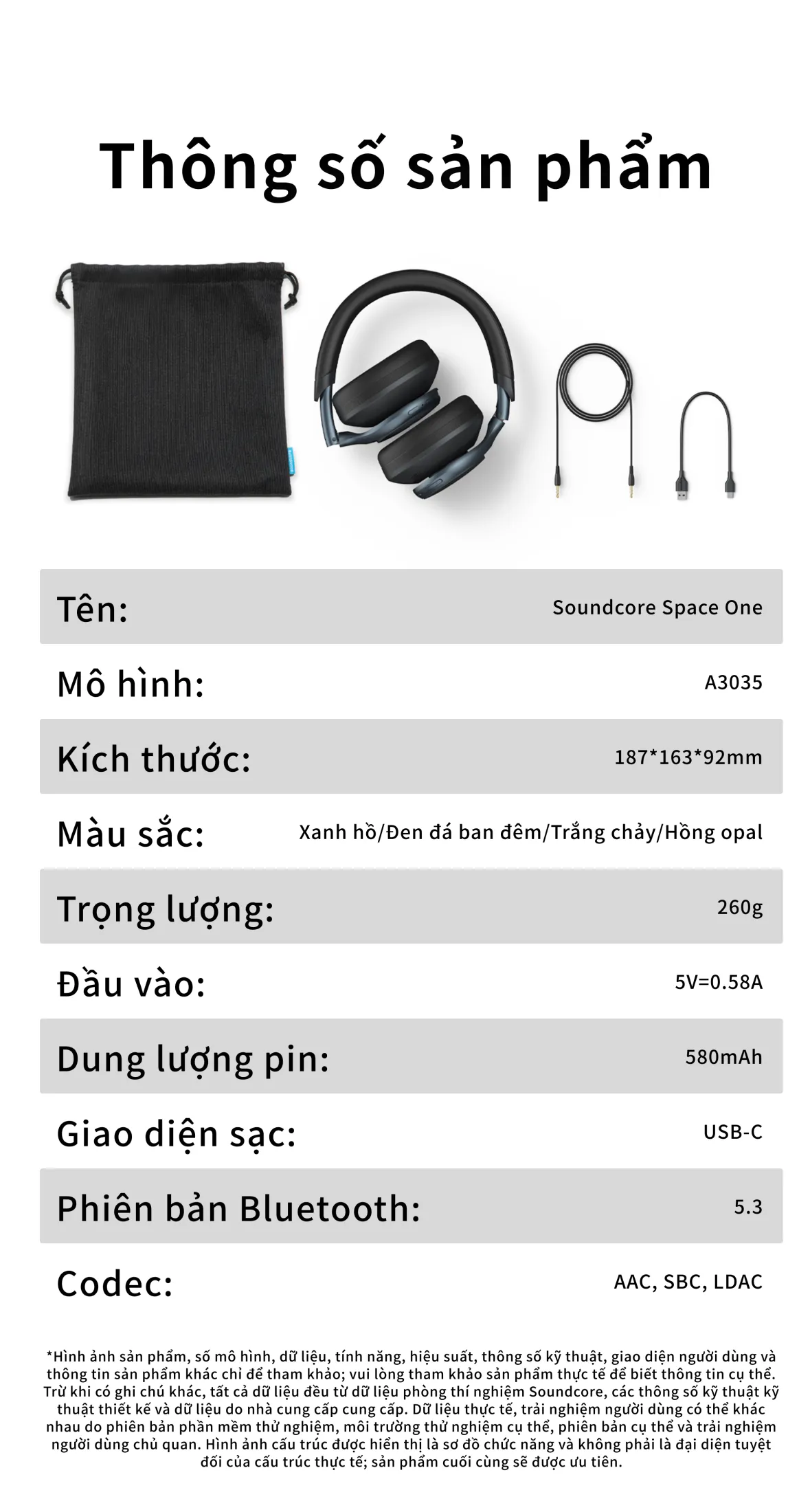 Tai nghe Space One (model A3035) được thiết kế với trọng lượng 260g, kích thước 187×163×92mm và hỗ trợ nhiều màu sắc: xanh hồ, đen đá ban đêm, trắng chảy và hồng opal. Điểm đáng chú ý nhất là bộ công nghệ khử tiếng ồn ba lớp, cùng với tính năng AdaptiveClear giúp tự động điều chỉnh mức khử âm tùy theo môi trường.