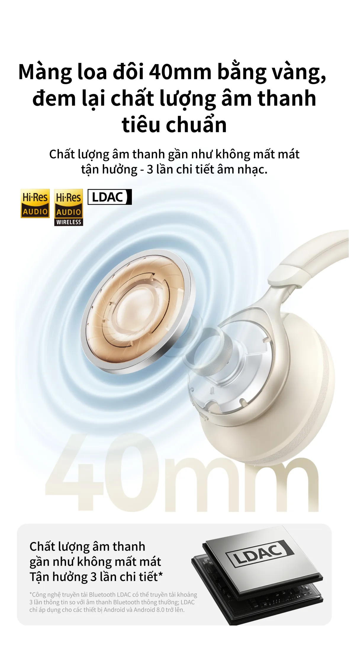 Khả năng truyền tải dữ liệu cao của LDAC giúp nghe được các chi tiết nhỏ trong bản nhạc, từ âm trầm sâu cho tới những nốt giai điệu nhẹ nhàng. Khi kết hợp với loa 40mm vàng, Tai nghe Space One mang lại sự cân bằng tuyệt vời giữa độ trung thực và động lực.