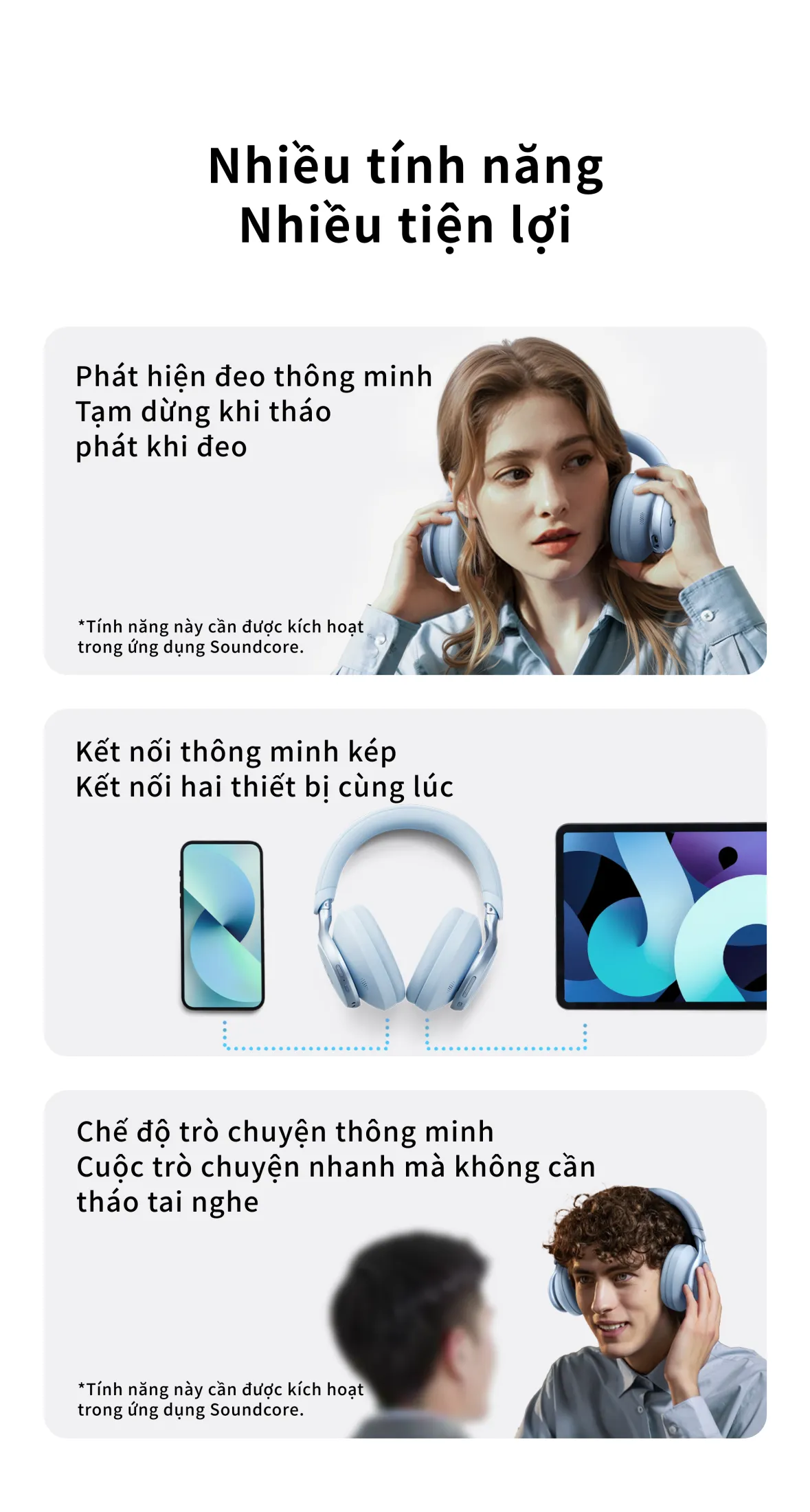 - Chế độ thông minh: Kết nối hai thiết bị cùng lúc, chế độ trò chuyện nhanh không cần tháo tai nghe.