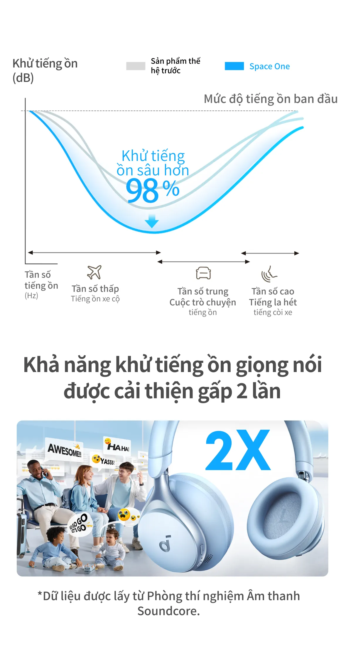 Tai nghe Space One được trang bị công nghệ khử tiếng ồn nâng cấp, đạt tới 98% giảm tiếng ồn. Đặc biệt, nó có khả năng giảm tiếng nói gấp 2 lần so với các mẫu trước (so sánh với Soundcore Life Q30). Khả năng này được thực hiện thông qua việc sử dụng nhiều mic và thuật toán AI tối ưu hóa.