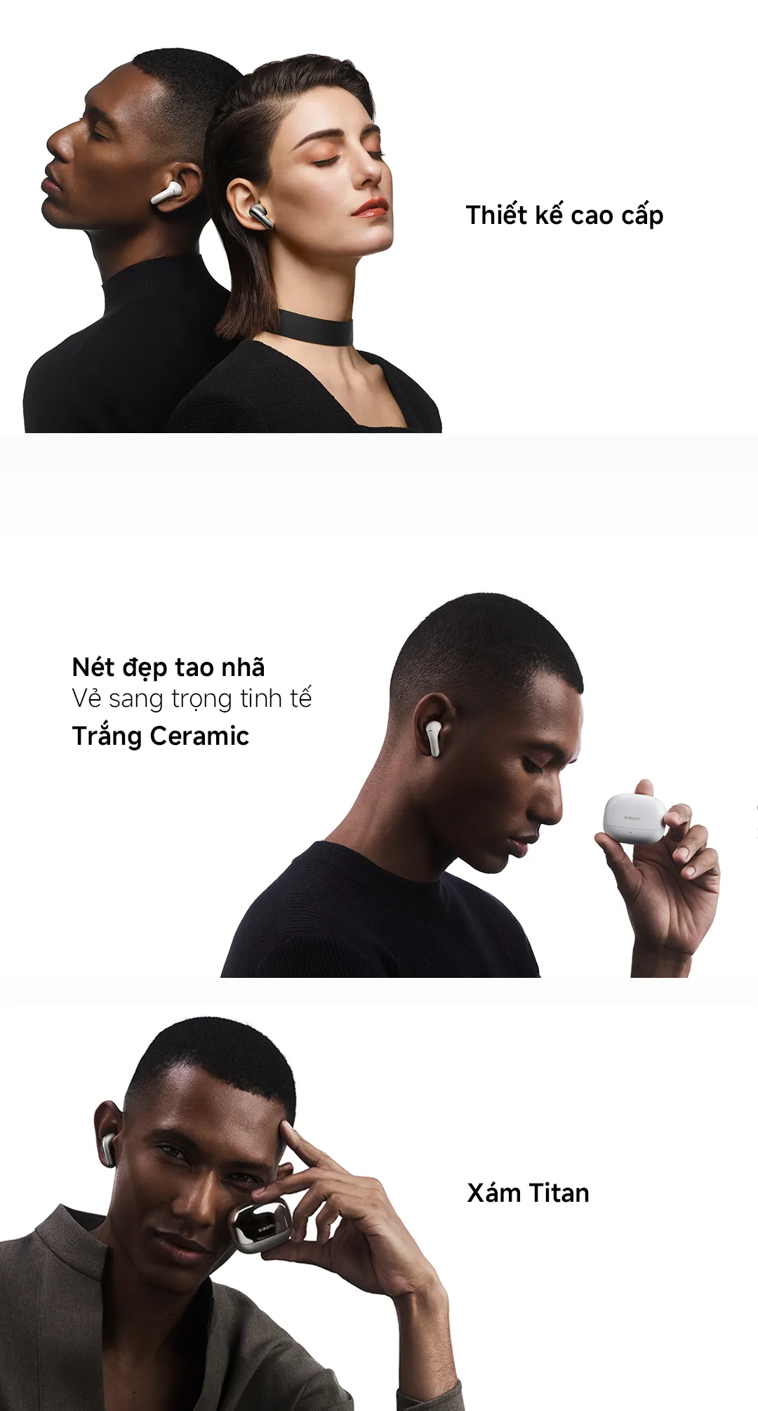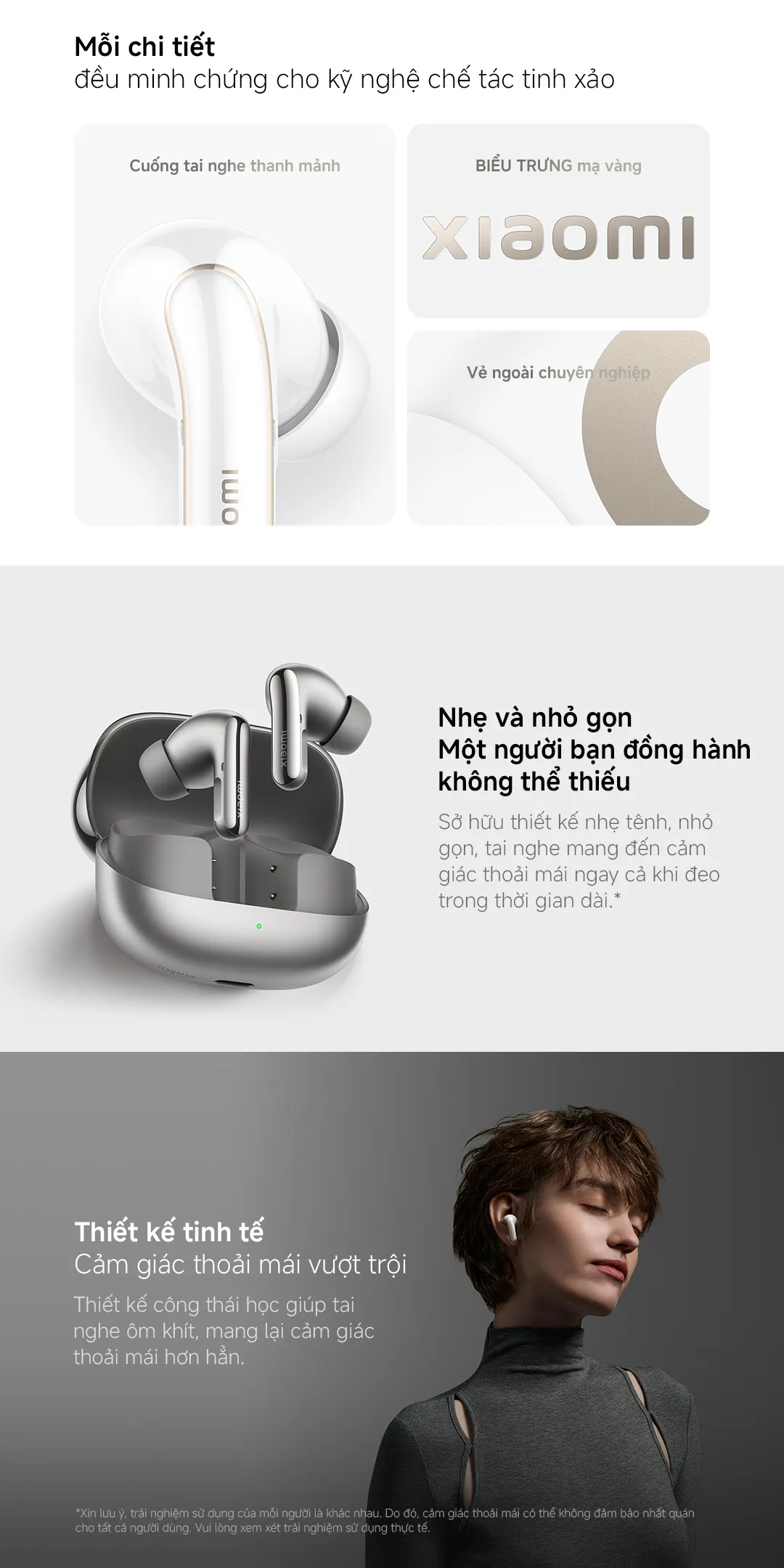 Tai nghe Tai nghe Xiaomi Buds 5 Pro được chế tác từ các vật liệu cao cấp như Trắng Ceramic và Xám Titan, tạo nên vẻ ngoài tinh tế, thanh lịch. Cuống tai nhỏ gọn với biểu trưng mạ vàng của thương hiệu không chỉ là điểm nhấn thẩm mỹ mà còn giúp giảm trọng lượng tổng thể, mang lại cảm giác nhẹ nhàng khi đeo trong thời gian dài. Nhờ thiết kế công thái học, tai nghe ôm khít vào ốc tai mỗi người, vì vậy bạn sẽ cảm nhận được sự thoải mái vượt trội dù dành nhiều giờ để thưởng thức âm nhạc hoặc tham gia cuộc họp trực tuyến.