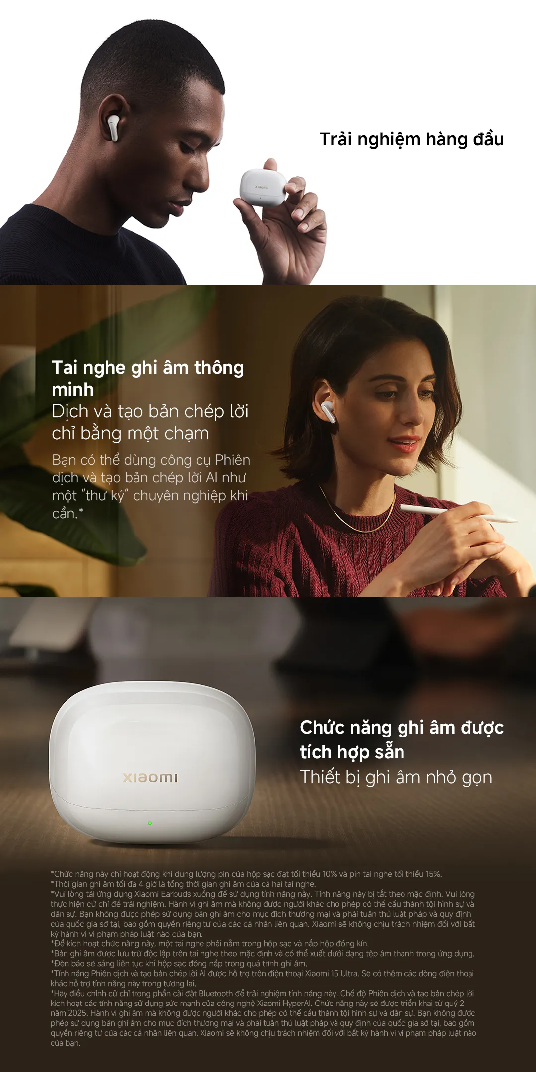 Để hỗ trợ người dùng trong công việc, Tai nghe Xiaomi Buds 5 Pro tích hợp chức năng ghi âm nhỏ gọn. Khi một tai nghe được đặt trong hộp sạc và pin đủ, bạn có thể bắt đầu ghi âm ngay từ điện thoại thông qua ứng dụng Xiaomi Earbuds. Bên cạnh đó, tính năng dịch thuật và tạo bản chép lời AI (HyperAI) sẽ trở thành “thư ký” ảo giúp chuyển đổi nội dung hội nghị sang văn bản nhanh chóng, tiện lợi.