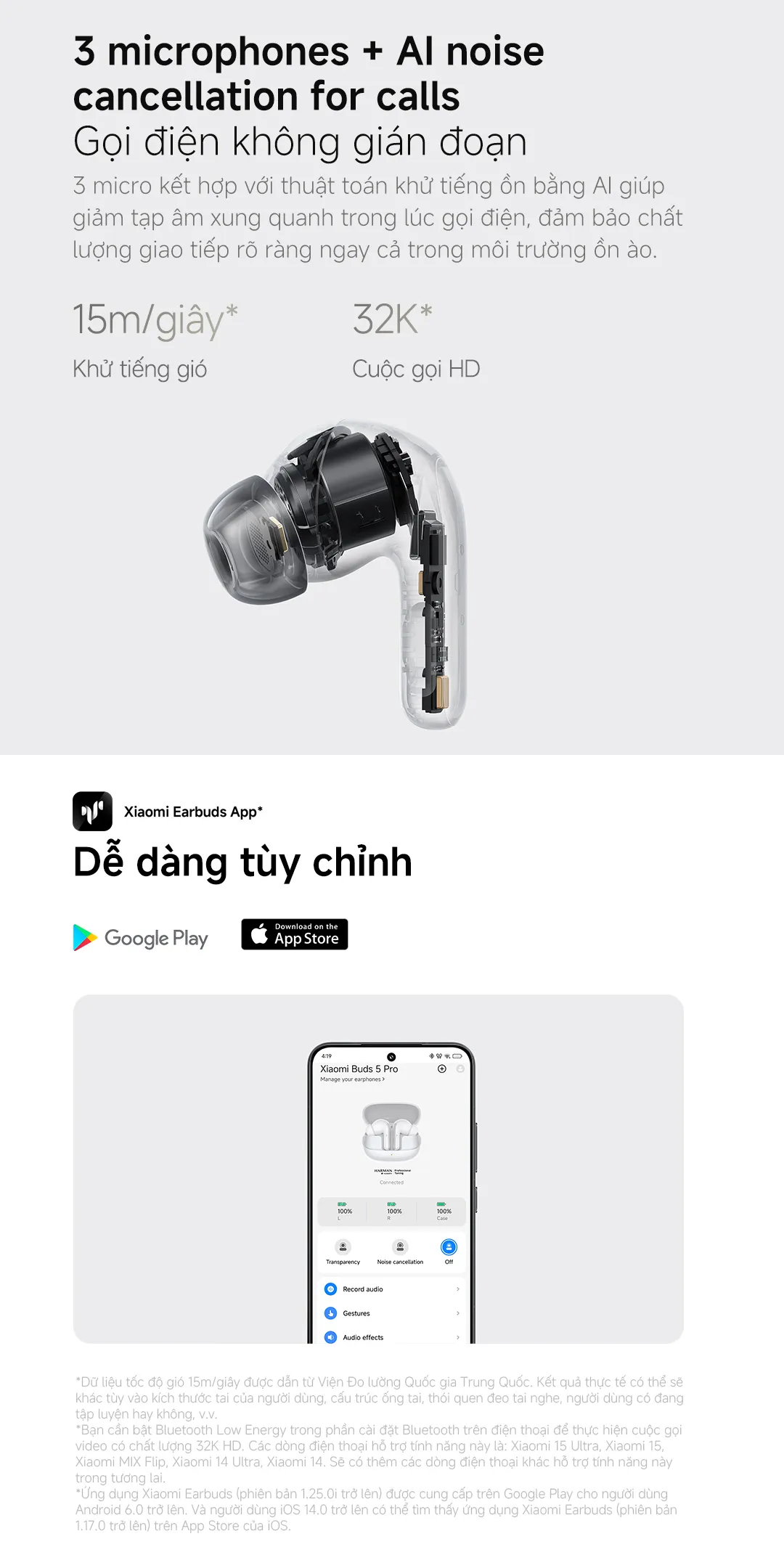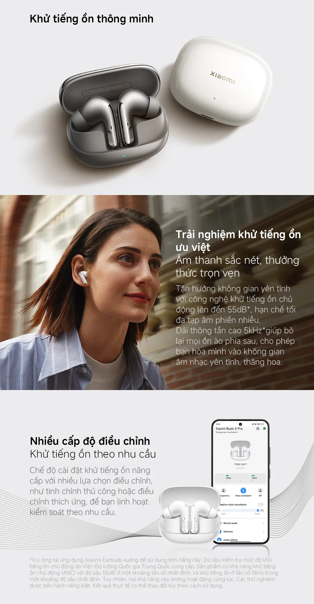 Bạn có thể bỏ qua mọi tiếng ồn xung quanh khi đang dạo phố hay làm việc trong văn phòng nhộn lộn. Công nghệ khử tiếng ồn ANC 55dB của Tai nghe Xiaomi Buds 5 Pro đã được thử nghiệm tại Viện Đo lường Quốc gia Trung Quốc, cho thấy khả năng loại bỏ tiếng ồn lên tới mức độ đáng kể. Ngoài ra, bộ ba micro tích hợp cùng thuật toán AI giúp giảm tạp âm khi gọi điện, đảm bảo chất lượng hội thoại rõ ràng ngay cả trong môi trường ồn ào.