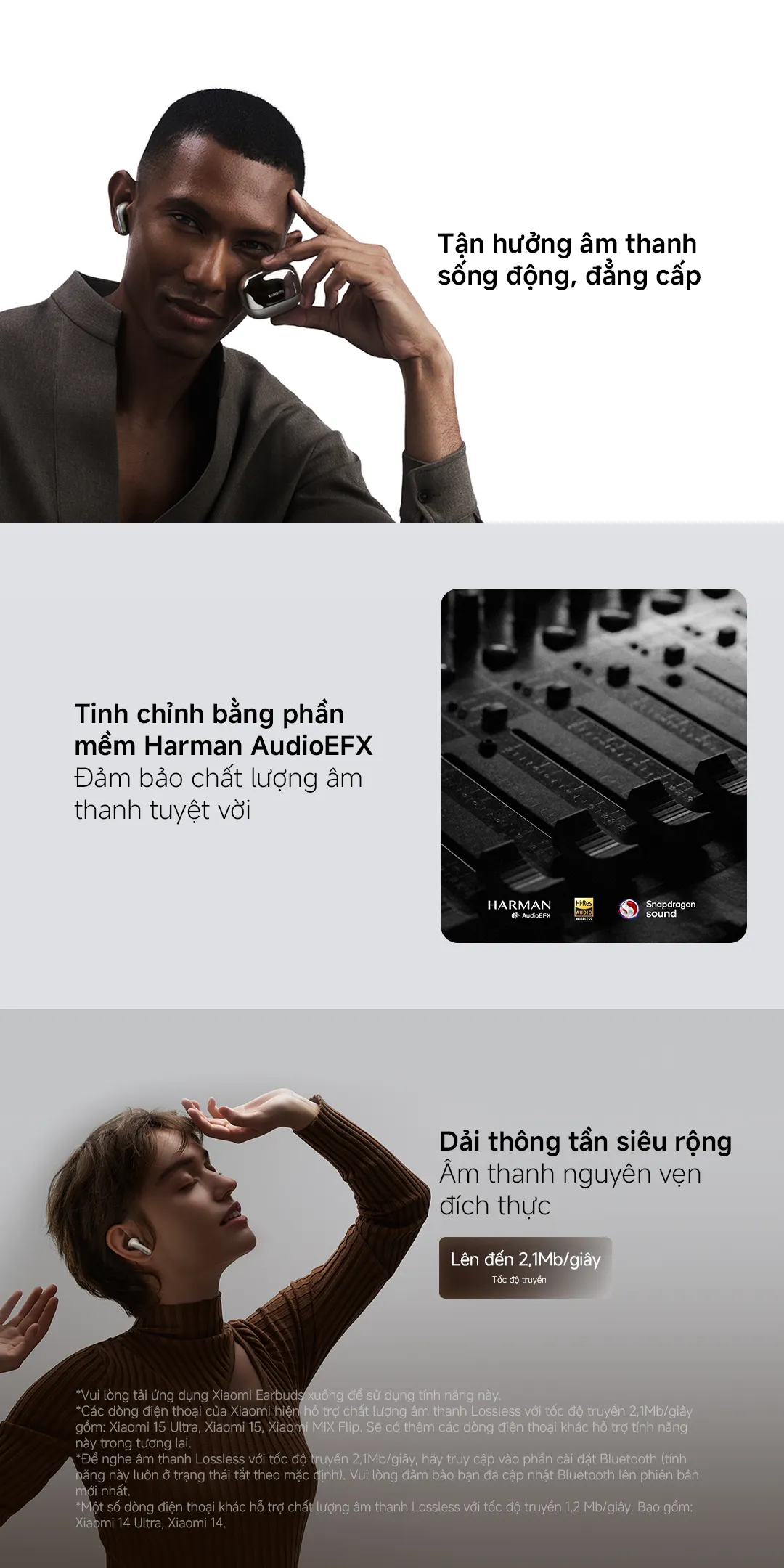 Thích ứng với phong cách nghe của từng người, Tai nghe Xiaomi Buds 5 Pro hỗ trợ hai cấu hình EQ chuyên biệt: “Music” và “Movie”. Bạn có thể tinh chỉnh âm thanh theo sở thích bằng phần mềm Harman AudioEFX, điều chỉnh dải tần từ 15 kHz đến 50 kHz để tạo ra trải nghiệm âm thanh sống động, chi tiết. Công nghệ này còn hỗ trợ tính năng đa chiều, theo dõi chuyển động đầu và tự động điều chỉnh vị trí âm thanh sao cho phù hợp với khung hình mà bạn đang xem.