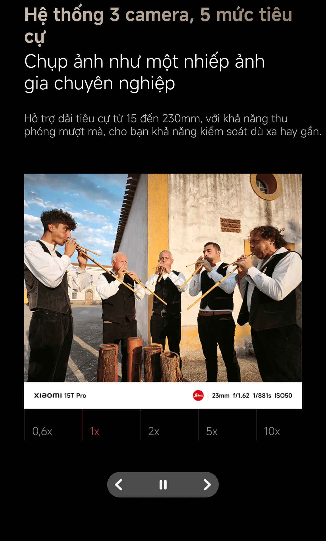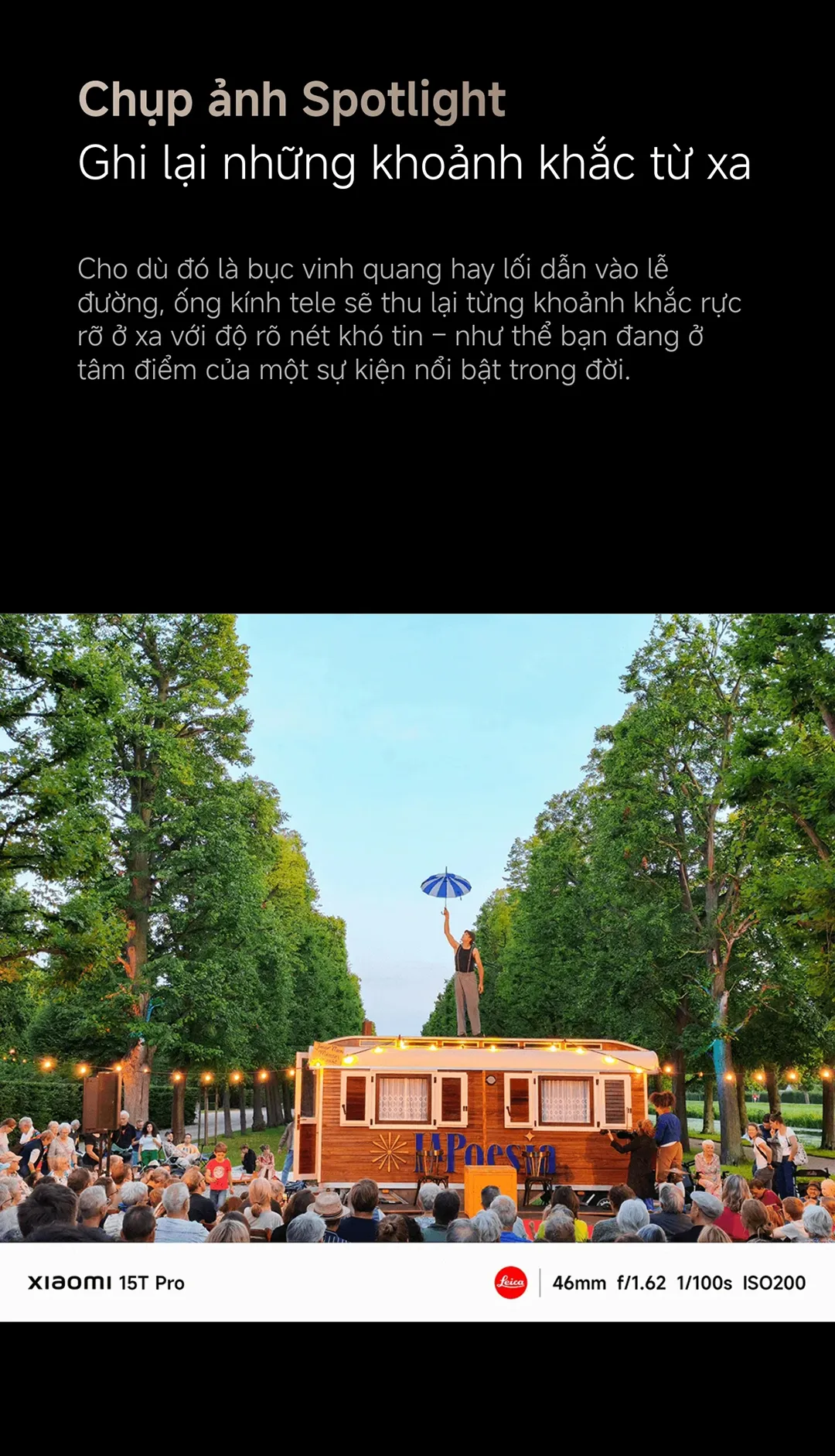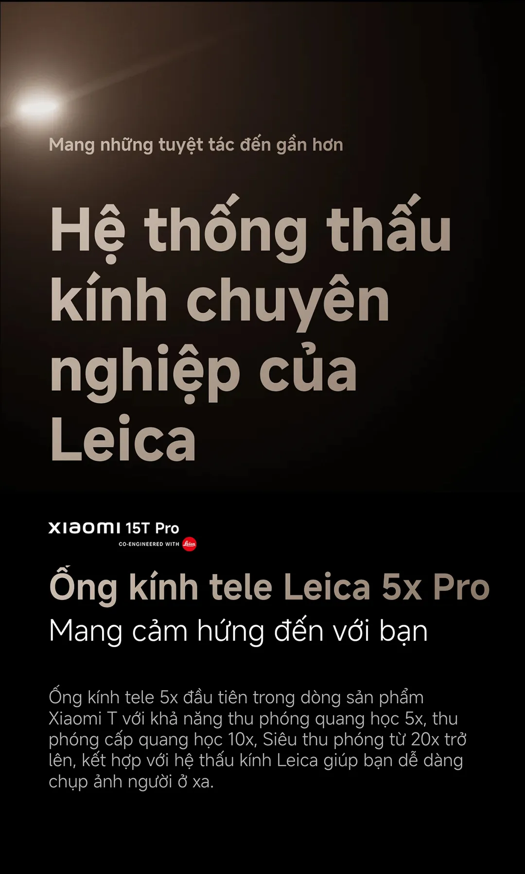 3. Ống kính tele Leica 5x Pro: Thu phóng quang học 5× và thu phóng cấp quang học lên tới 10×; hỗ trợ siêu thu phóng từ 20x trở lên. Khi muốn chụp ảnh người ở xa hoặc cảnh vật rộng lớn, bạn chỉ cần nhấn vào chế độ “Spotlight” để Leica tự động tinh chỉnh khẩu độ và ISO.
