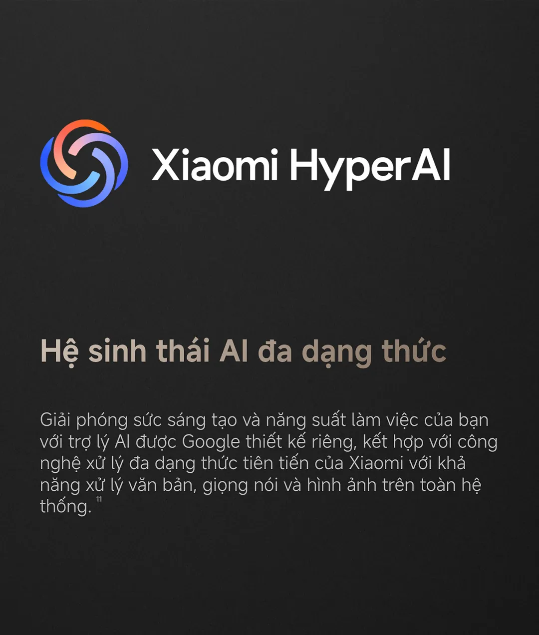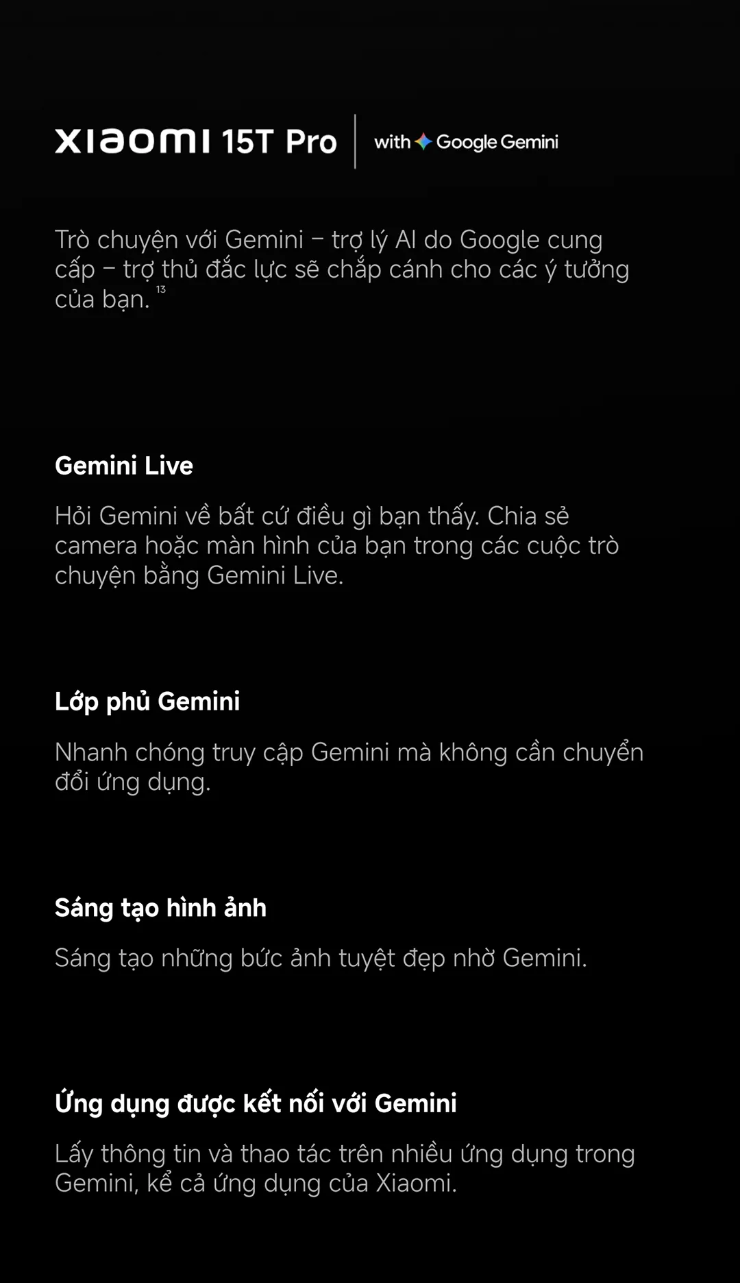 Được trang bị Xiaomi HyperAI, chiếc điện thoại hỗ trợ xử lý văn bản, giọng nói và hình ảnh trực tiếp trên thiết bị. Ngoài ra, tích hợp với Google Gemini mang đến trợ lý AI mạnh mẽ: “Gemini Live” cho phép bạn hỏi bất kỳ câu hỏi nào, chia sẻ màn hình, hoặc thậm chí tạo ảnh sáng tạo ngay tức thì.