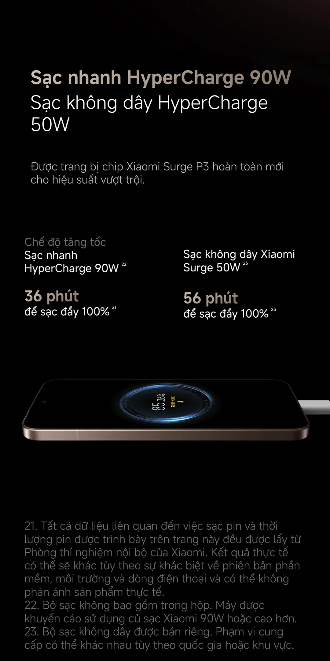 • Sạc nhanh 90W có dây: Đến 100% chỉ trong khoảng 36 phút.