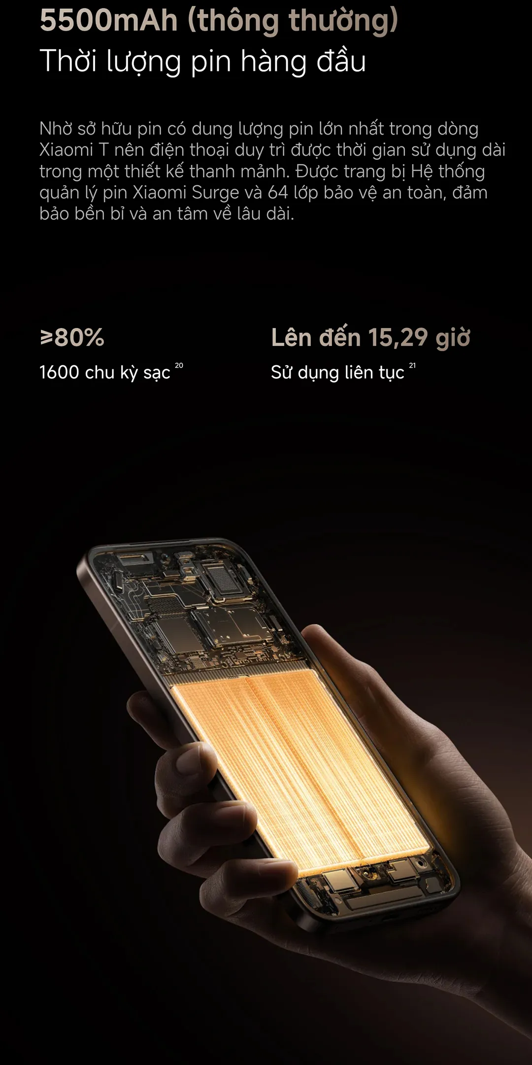 Xiaomi 15T Pro được trang bị pin dung lượng 5500 mAh (typ), giúp bạn sử dụng trong suốt cả ngày mà không lo hết pin. Kết hợp với hệ thống quản lý pin Xiaomi Surge và HyperCharge, bạn sẽ thấy: