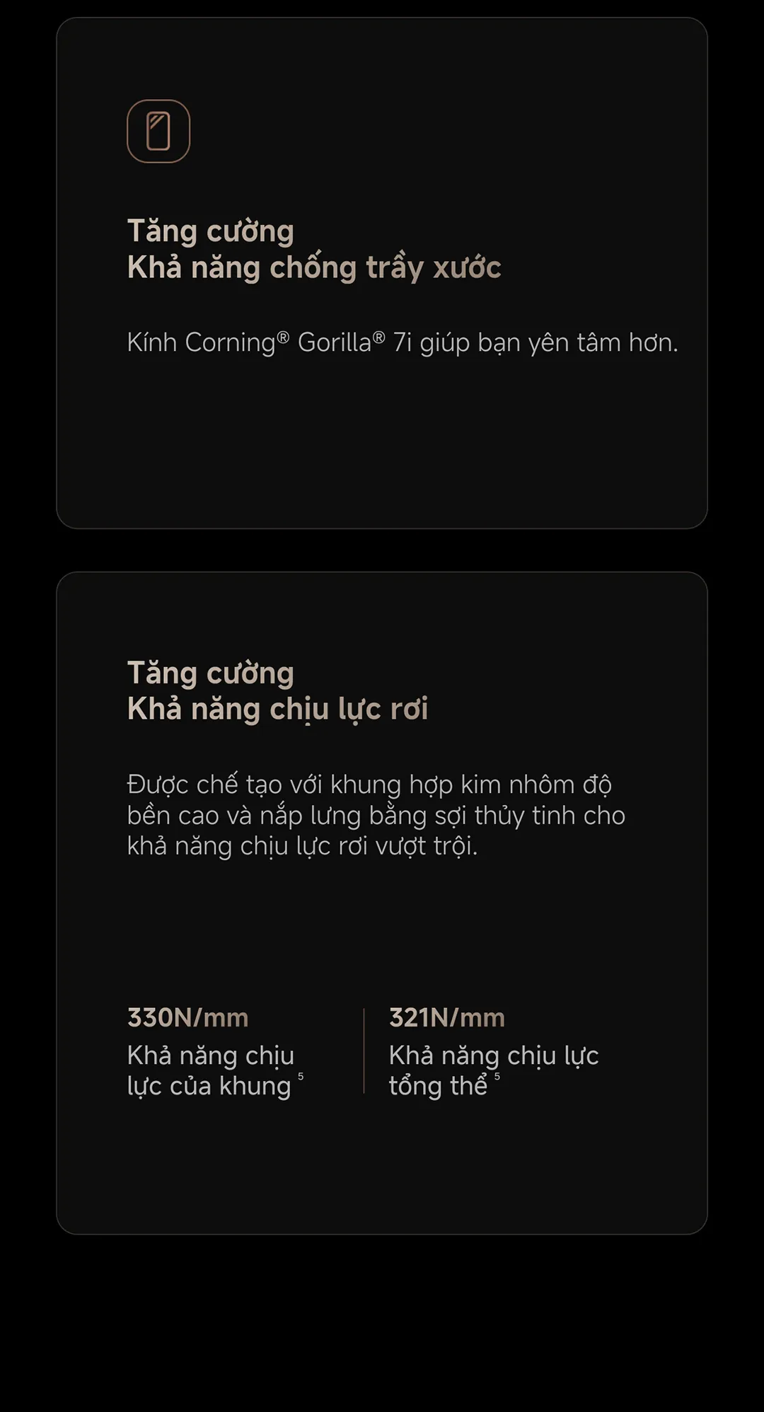 • Chất liệu: Lớp sợi thủy tinh kết hợp với khung kim loại, chống trầy xước bằng kính Corning® Gorilla® 7i.