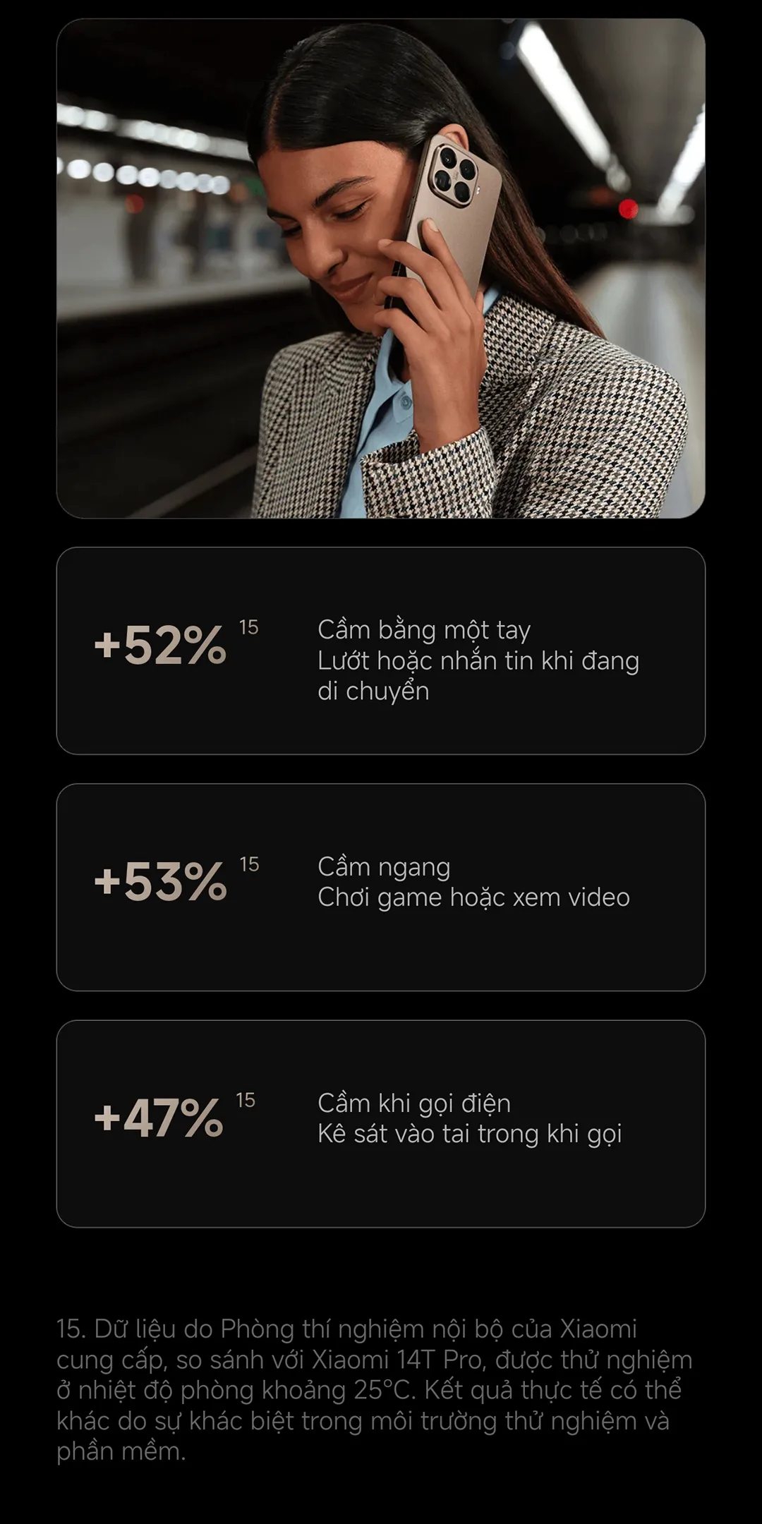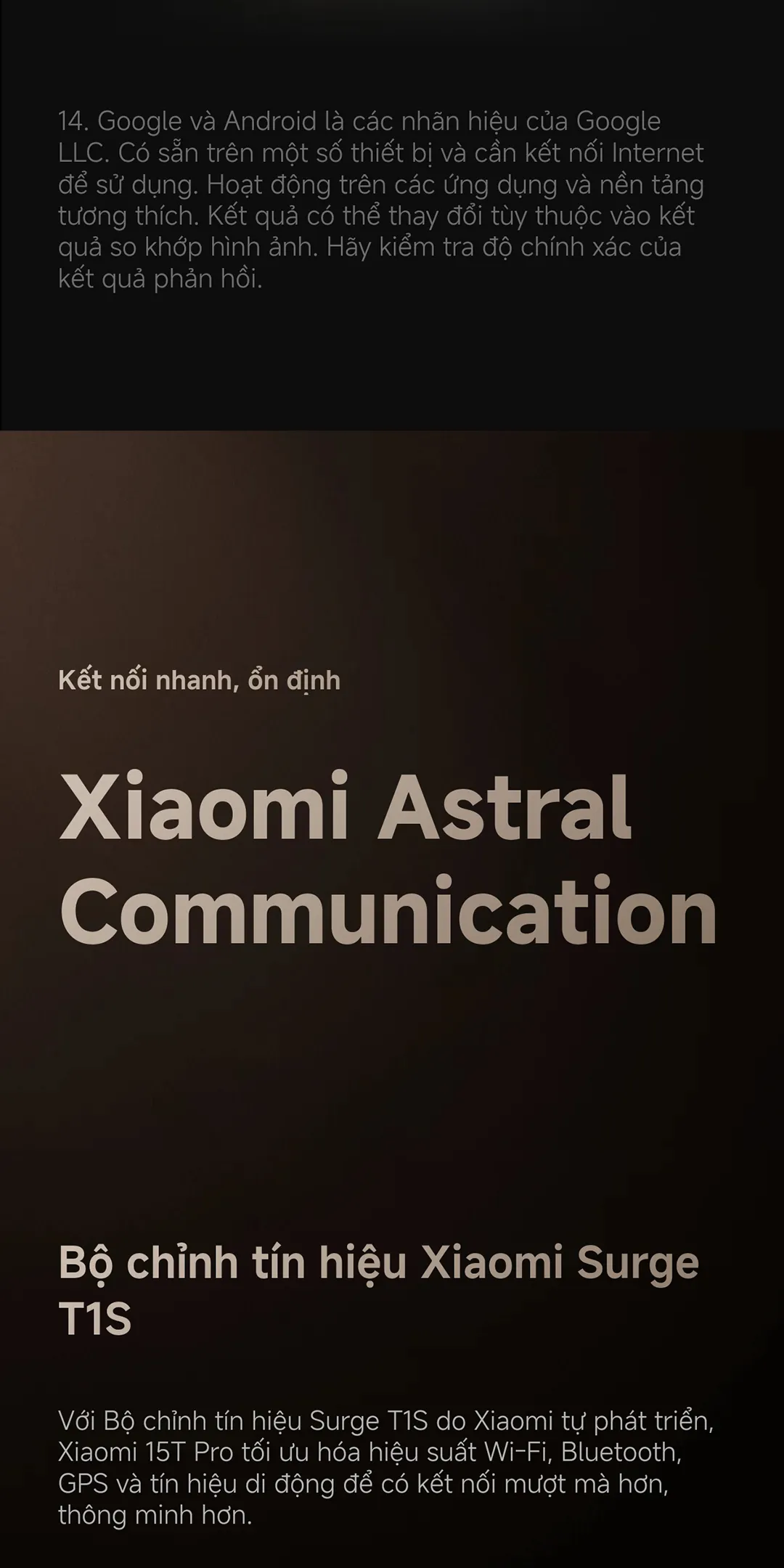 Với Xiaomi 15T Pro, kết nối luôn ổn định. Công nghệ Surge T1S tối ưu Wi‑Fi, Bluetooth và GPS; cùng “Super Antenna Array” hỗ trợ đa chế độ tín hiệu 16 trường hợp sử dụng.