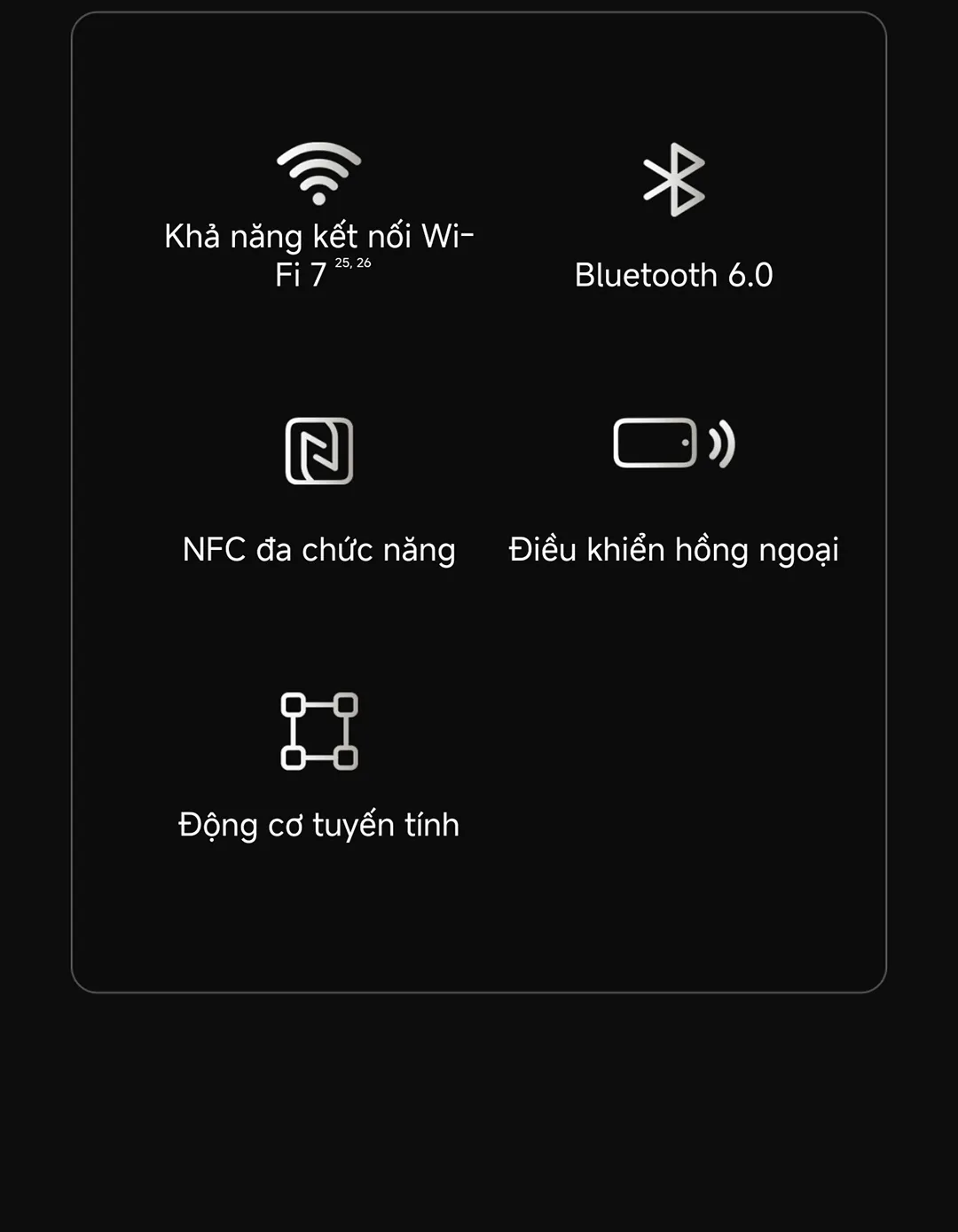 • Cấu hình hỗ trợ Wi‑Fi 7, Bluetooth 6.0, NFC đa chức năng và điều khiển hồng ngoại.
