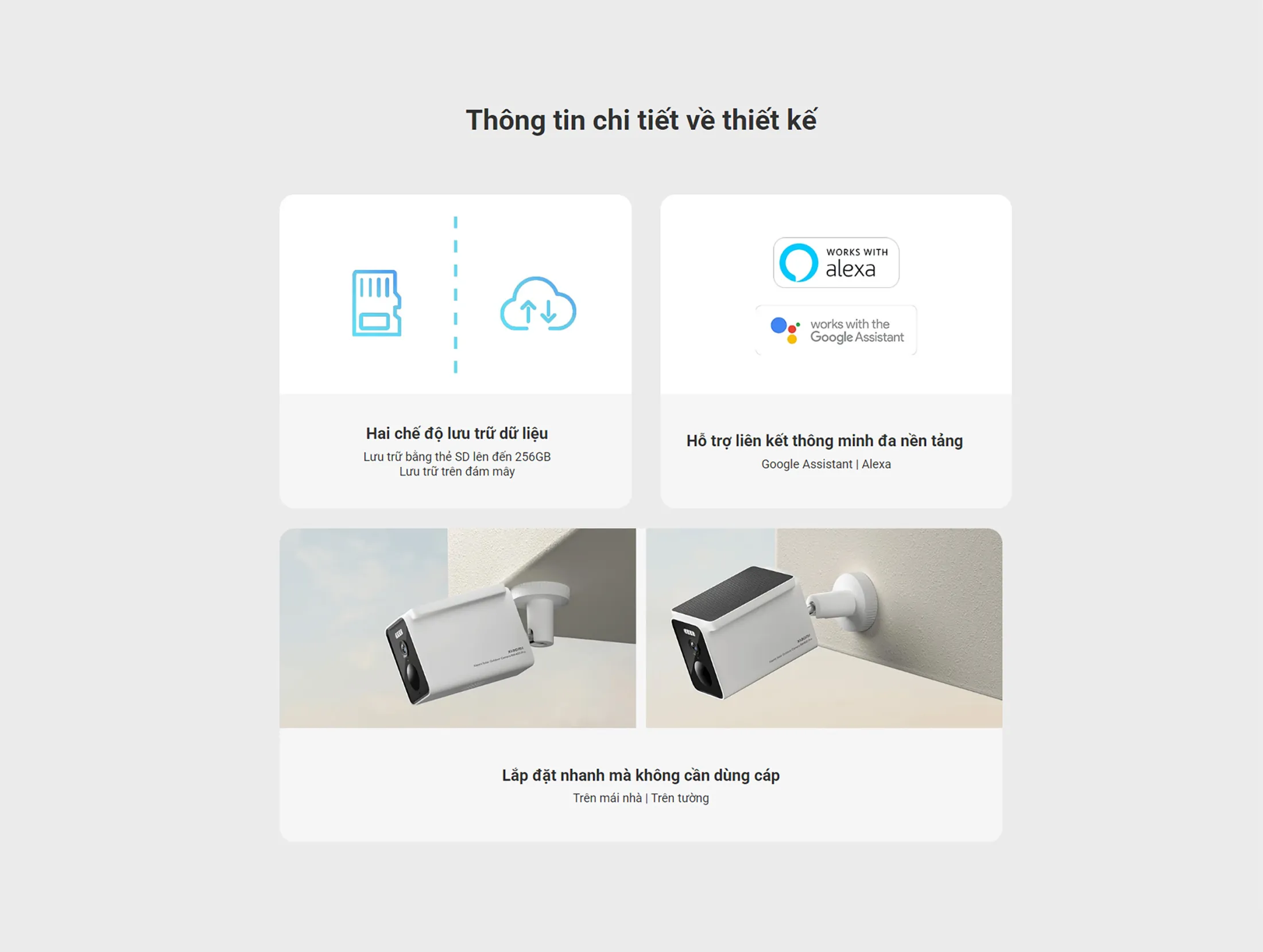Việc lắp đặt camera không đòi hỏi bất kỳ cáp điện hay dây internet nào. Bạn chỉ cần kết nối trạm gốc trong nhà với nguồn điện và mạng (Wi‑Fi hoặc cáp Ethernet). Camera sẽ tự động nhận diện trạm gốc, cho phép bạn lắp đặt ở vị trí mong muốn – trên mái nhà, tường cửa ra vào hoặc bất kỳ nơi có ánh sáng mặt trời tốt.