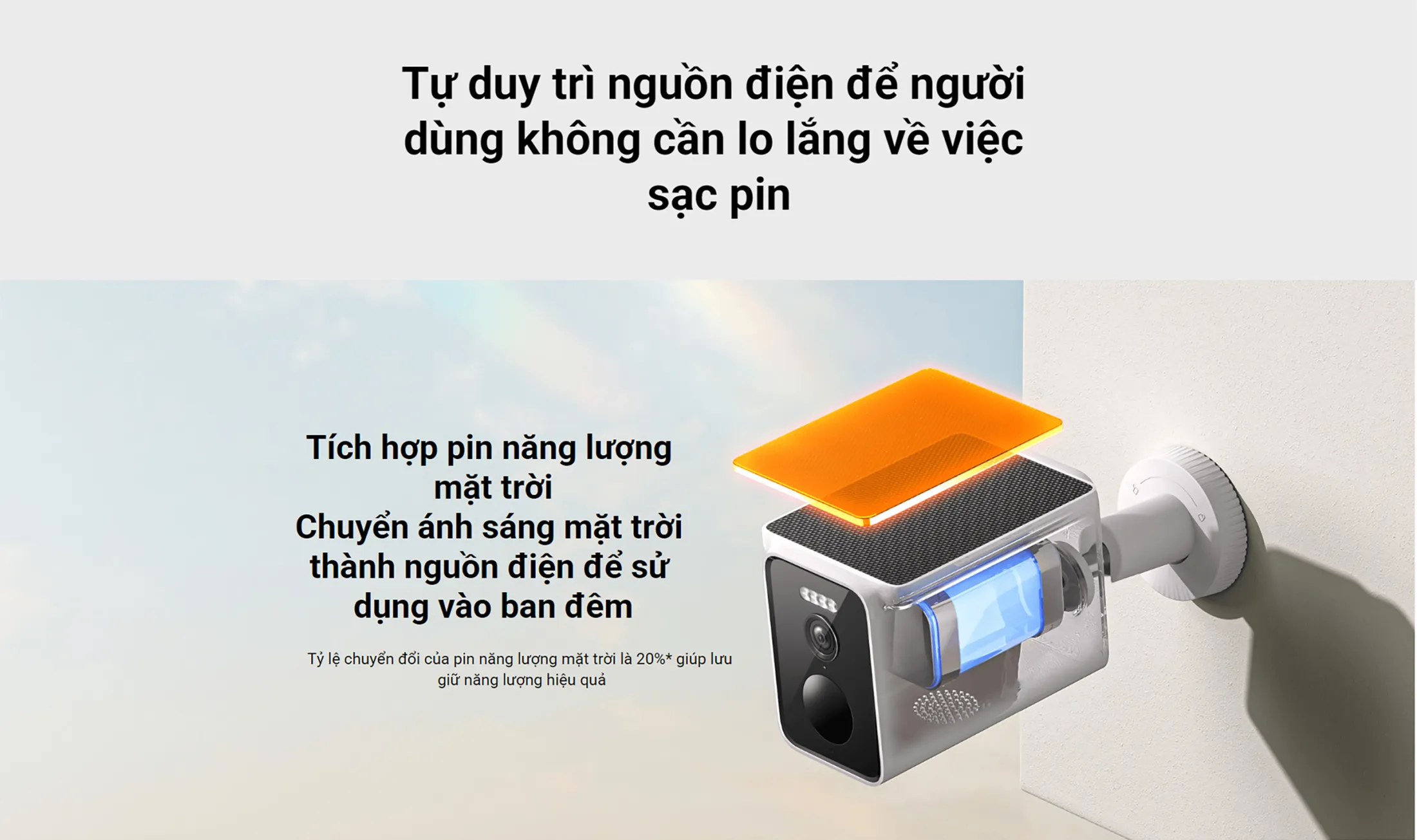 Điểm mạnh thực sự của Xiaomi BW400 Pro là khả năng tự duy trì nguồn điện nhờ pin dung lượng lớn và panel năng lượng mặt trời. Khi được đặt trong ánh sáng trực tiếp, hệ thống sẽ chuyển đổi khoảng 20% năng lượng thành điện, giúp camera hoạt động liên tục mà không cần sạc thường xuyên.