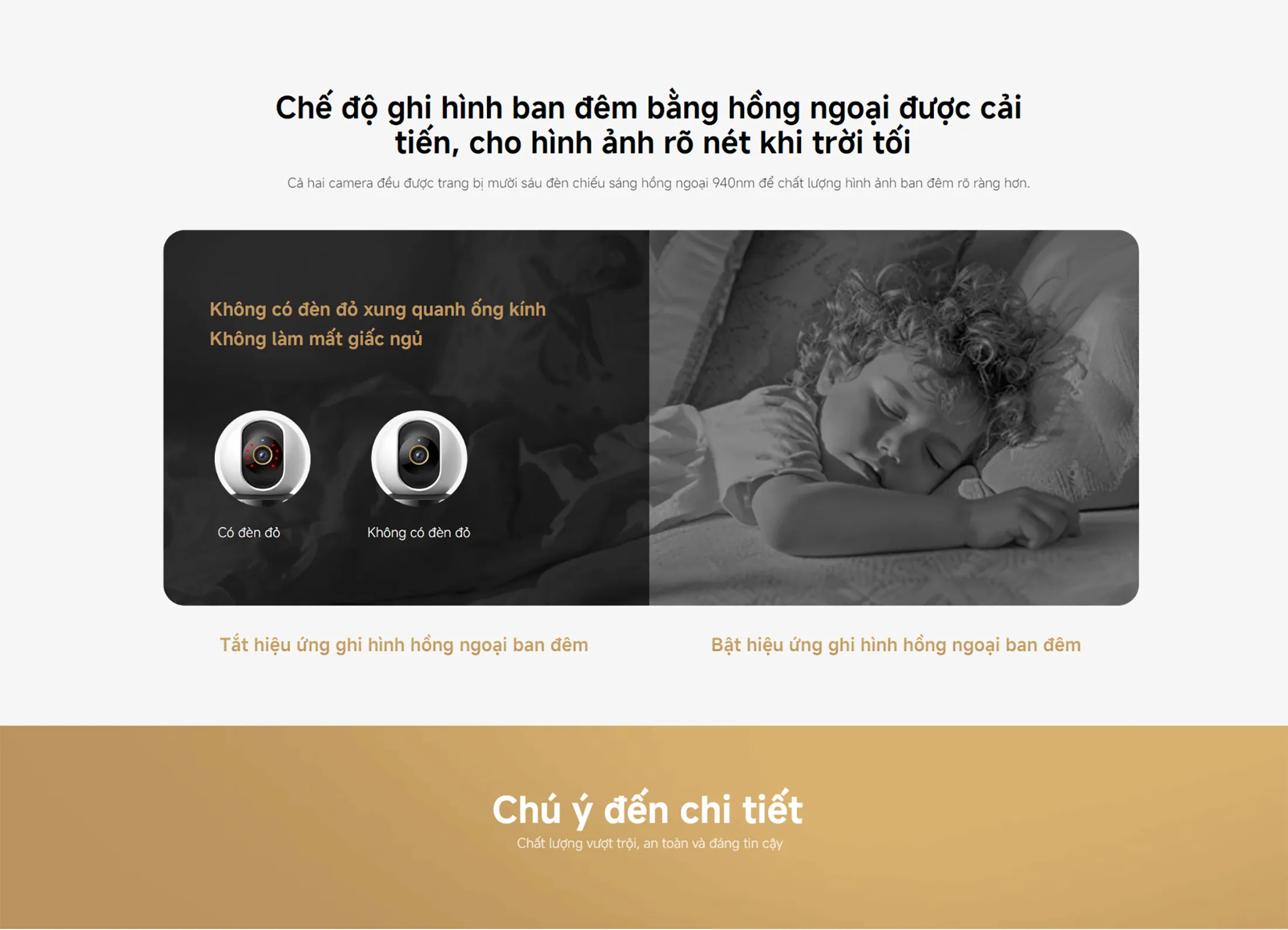 Hai camera đều được trang bị 16 đèn IR 940nm, giúp chiếu sáng đủ mạnh để nhận diện đối tượng mà không làm mất ngủ cho gia đình. Khác với một số sản phẩm có đèn đỏ quang quanh ống kính, Xiaomi C500 Dual loại bỏ hoàn toàn hiệu ứng này, mang lại trải nghiệm an toàn và thoải mái hơn.