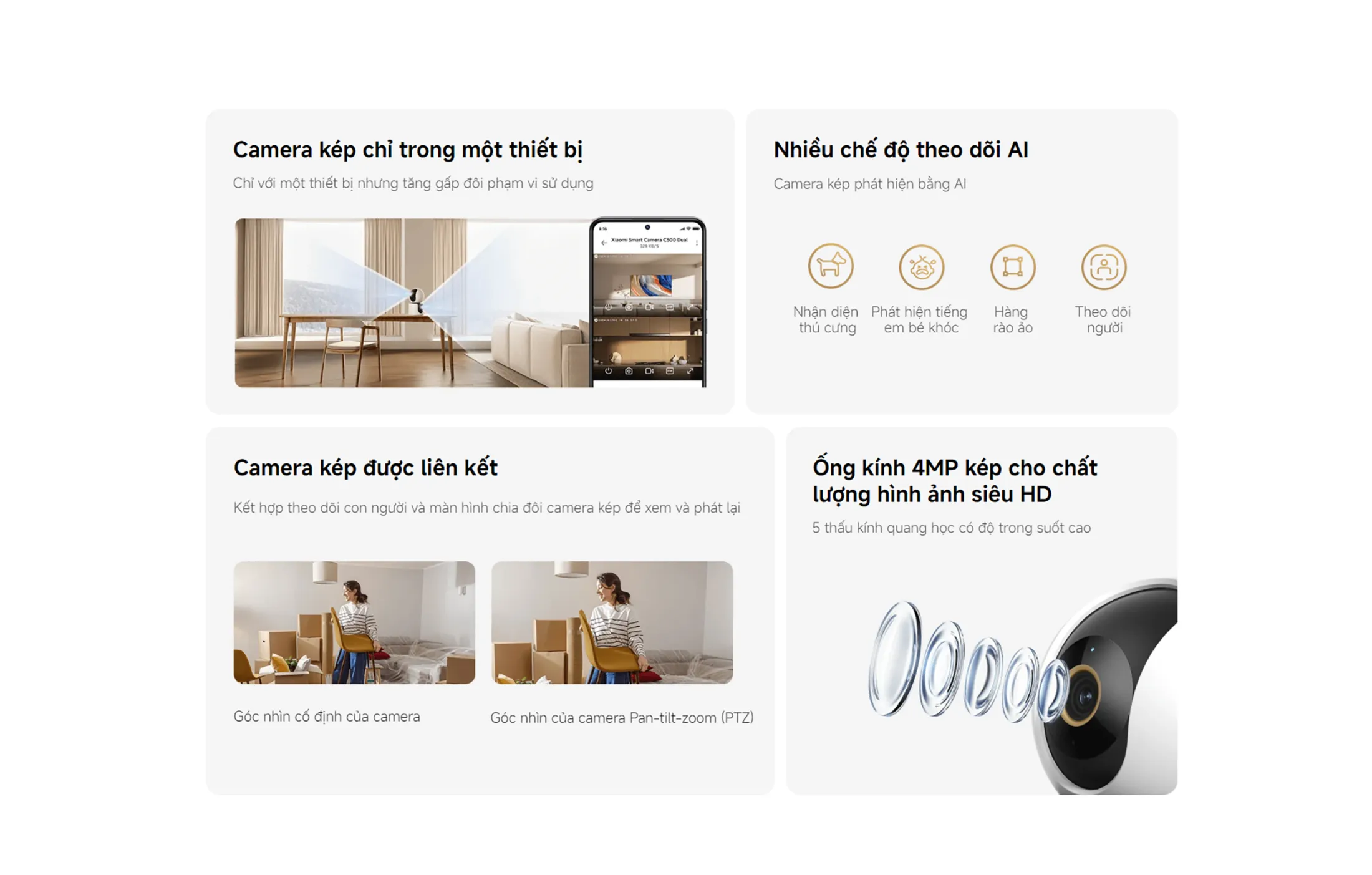Xiaomi Smart Camera C500 Dual được trang bị hai ống kính kép cùng khả năng chụp hình chất lượng siêu HD, đồng thời hỗ trợ góc nhìn cố định và PTZ (Pan‑Tilt‑Zoom). Điều này cho phép người dùng vừa có thể quan sát toàn cảnh một khu vực rộng lớn, vừa zoom vào chi tiết khi cần thiết – đặc biệt hữu ích trong việc giám sát 360 độ.