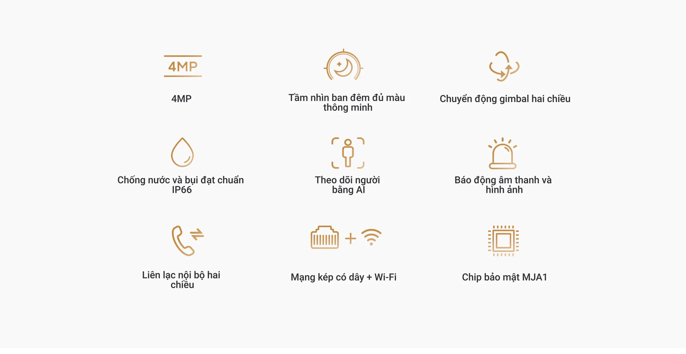 Điểm nổi bật: gimbal hai chiều, AI phát hiện người, báo động âm thanh & hình ảnh, hỗ trợ microSD dung lượng lên tới 256GB, mạng kép có dây + Wi‑Fi, chip bảo mật MJA1 và chuẩn IP66 chống nước/ bụi. Đây là một giải pháp toàn diện cho các ngôi nhà, văn phòng hay khu công nghiệp nhỏ.
