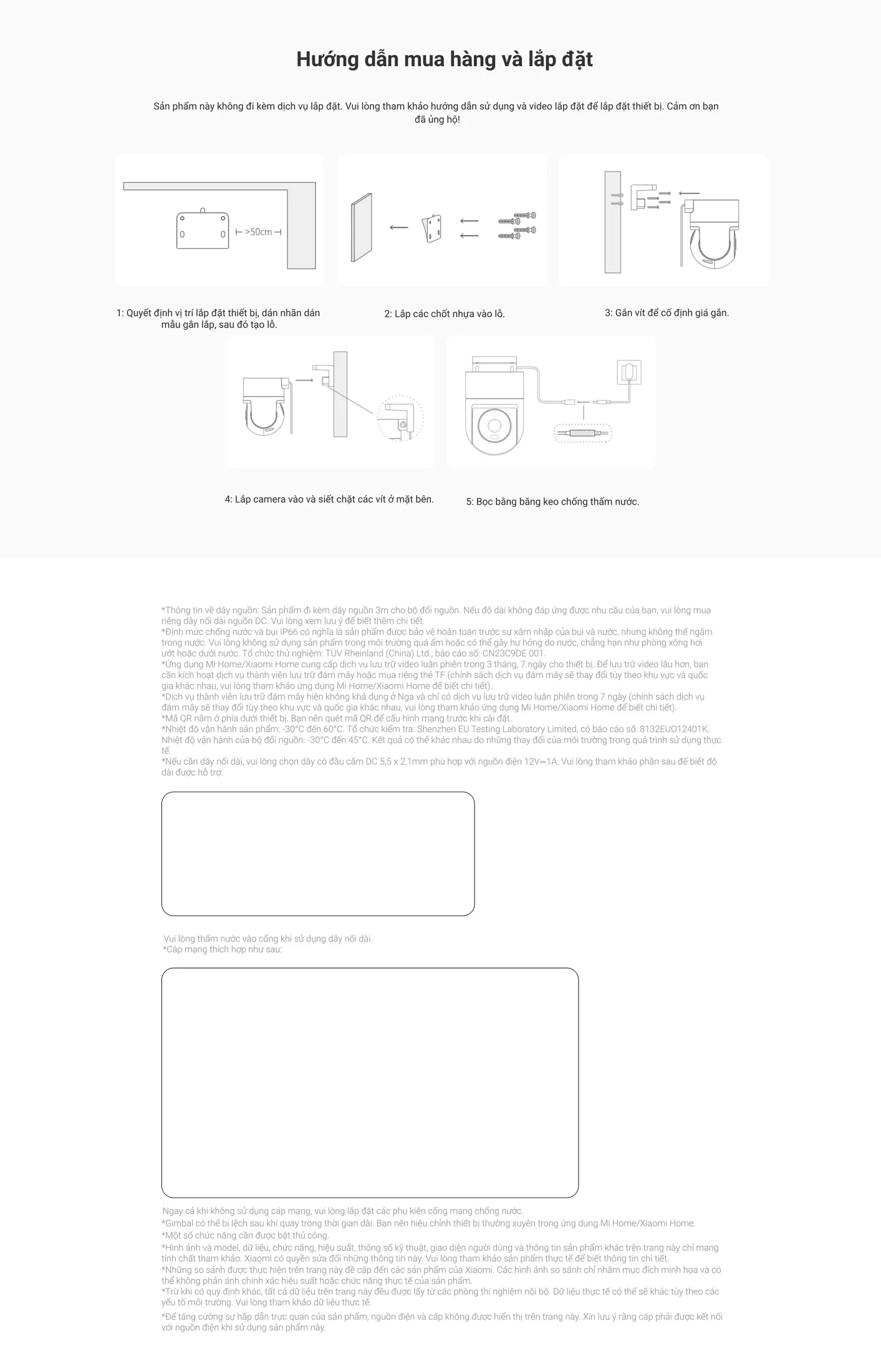 Bước 3: Kết nối nguồn DC 12V/1A và Ethernet (nếu chọn mạng có dây). Nếu sử dụng Wi‑Fi, quét mã QR dưới camera qua ứng dụng Mi Home/Xiaomi Home.