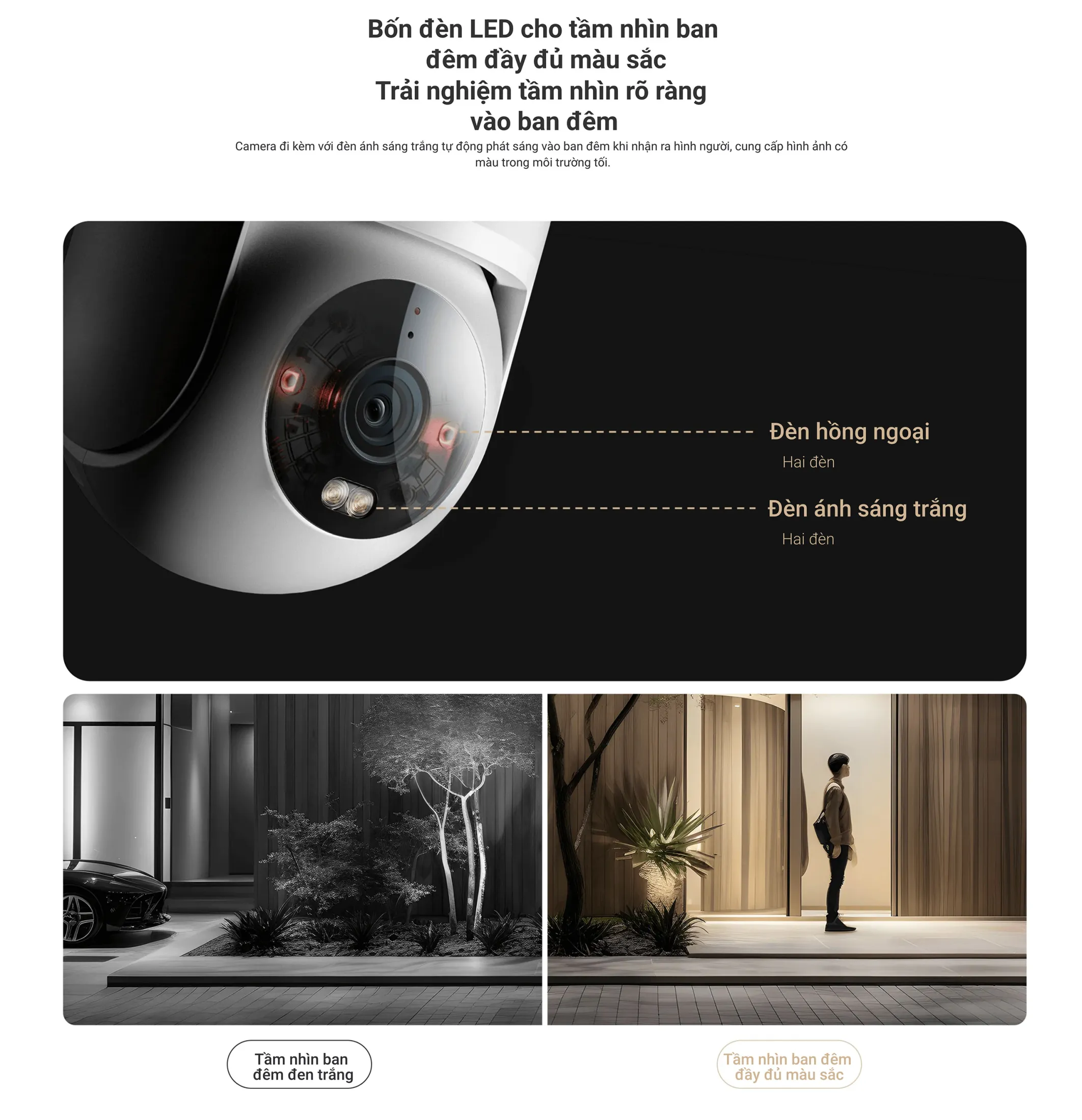 - Tầm nhìn ban đêm: Bốn LED hồng ngoại + hai đèn ánh sáng trắng tự động phát sáng khi nhận diện người. Bạn sẽ được hình ảnh màu đầy đủ trong điều kiện tối hoặc râm tưới.