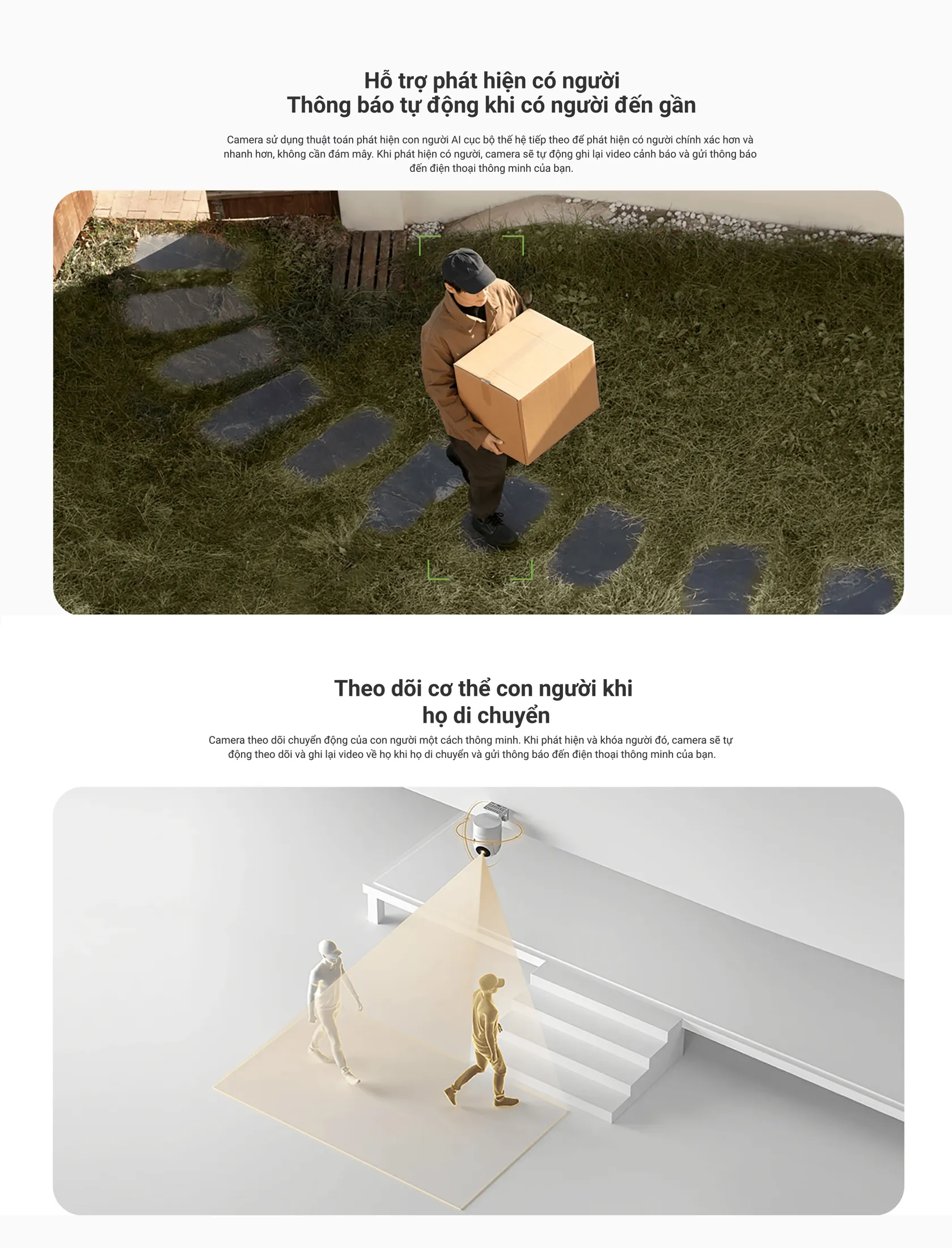 - AI phát hiện người: Thuật toán AI thế hệ tiếp theo, không cần đám mây để nhận diện nhanh chóng và chính xác. Khi phát hiện, camera ghi lại video, gửi thông báo ngay trên điện thoại.