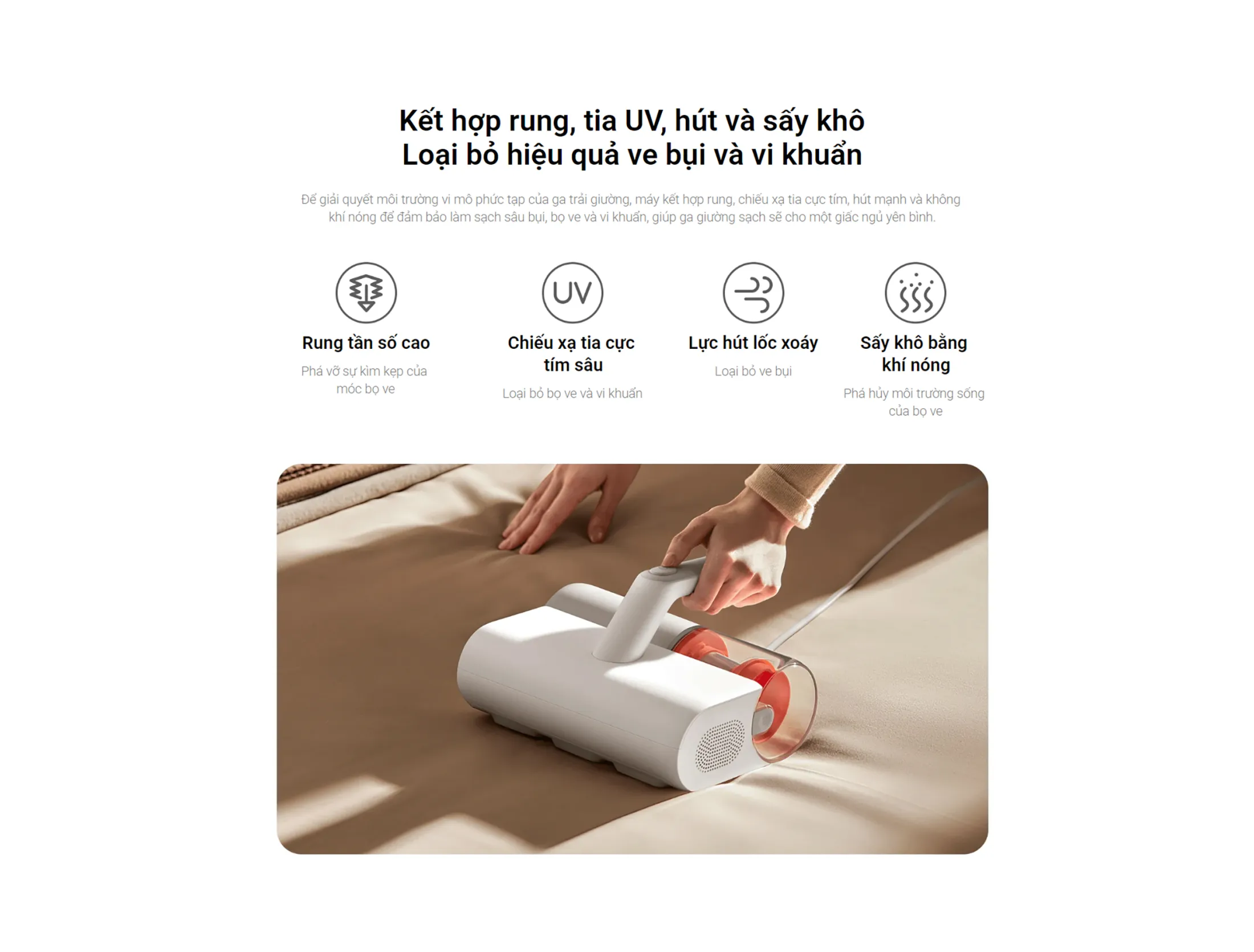 Xiaomi đã dành nhiều năm nghiên cứu để tạo ra một thiết bị có khả năng loại bỏ bọ ve hiệu quả, đồng thời bảo vệ sức khỏe cho cả gia đình. Đặc biệt, với lực hút 12000Pa, máy có thể hút được lông, mảnh vụn và bụi mịn ngay từ lớp sâu nhất của vải giường hoặc sofa.