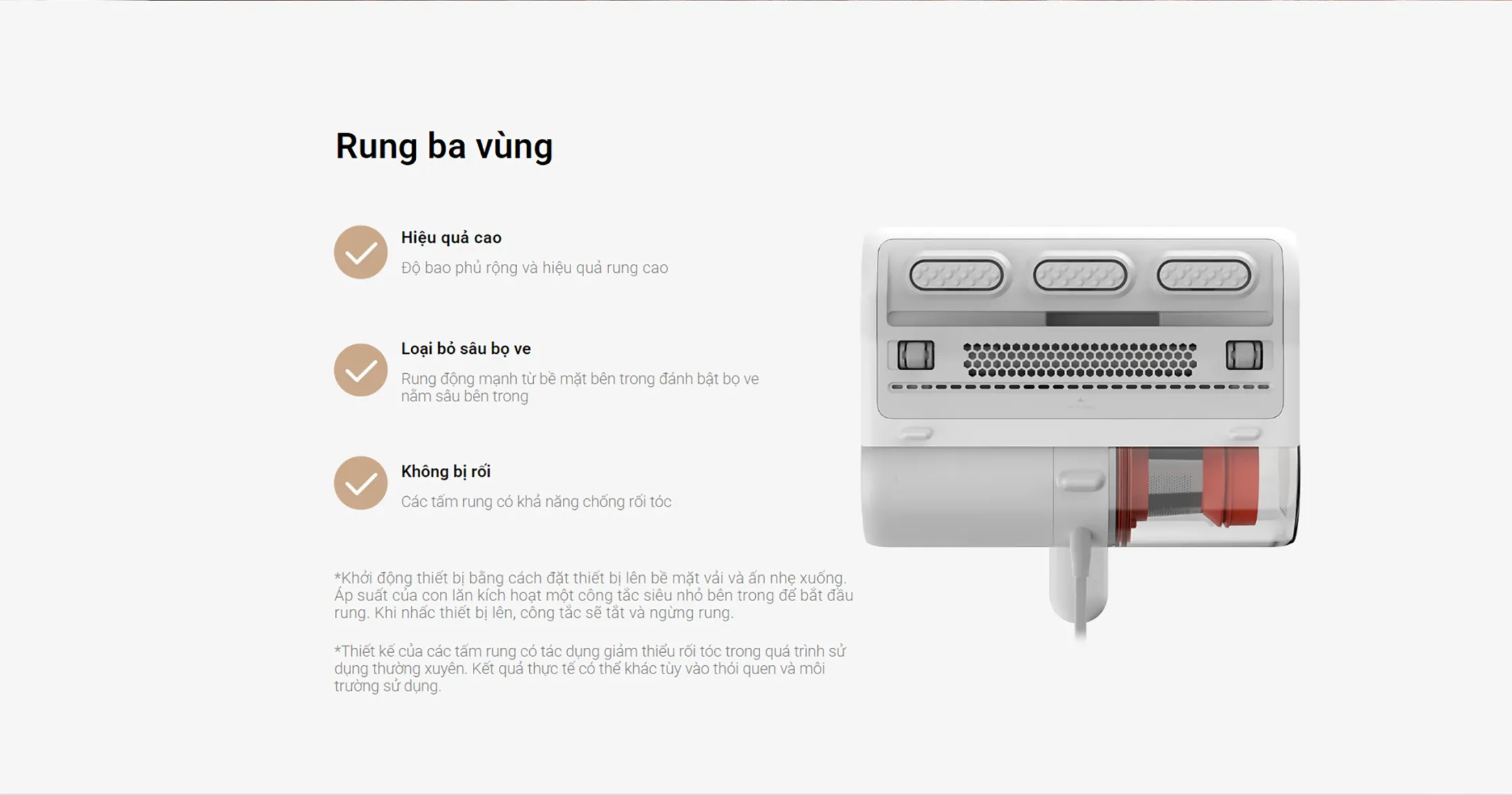 - Độ bao phủ rộng: Ba vùng rung được thiết kế để phủ sóng tới sâu nhất trong lớp vải mà không gây rối tóc.