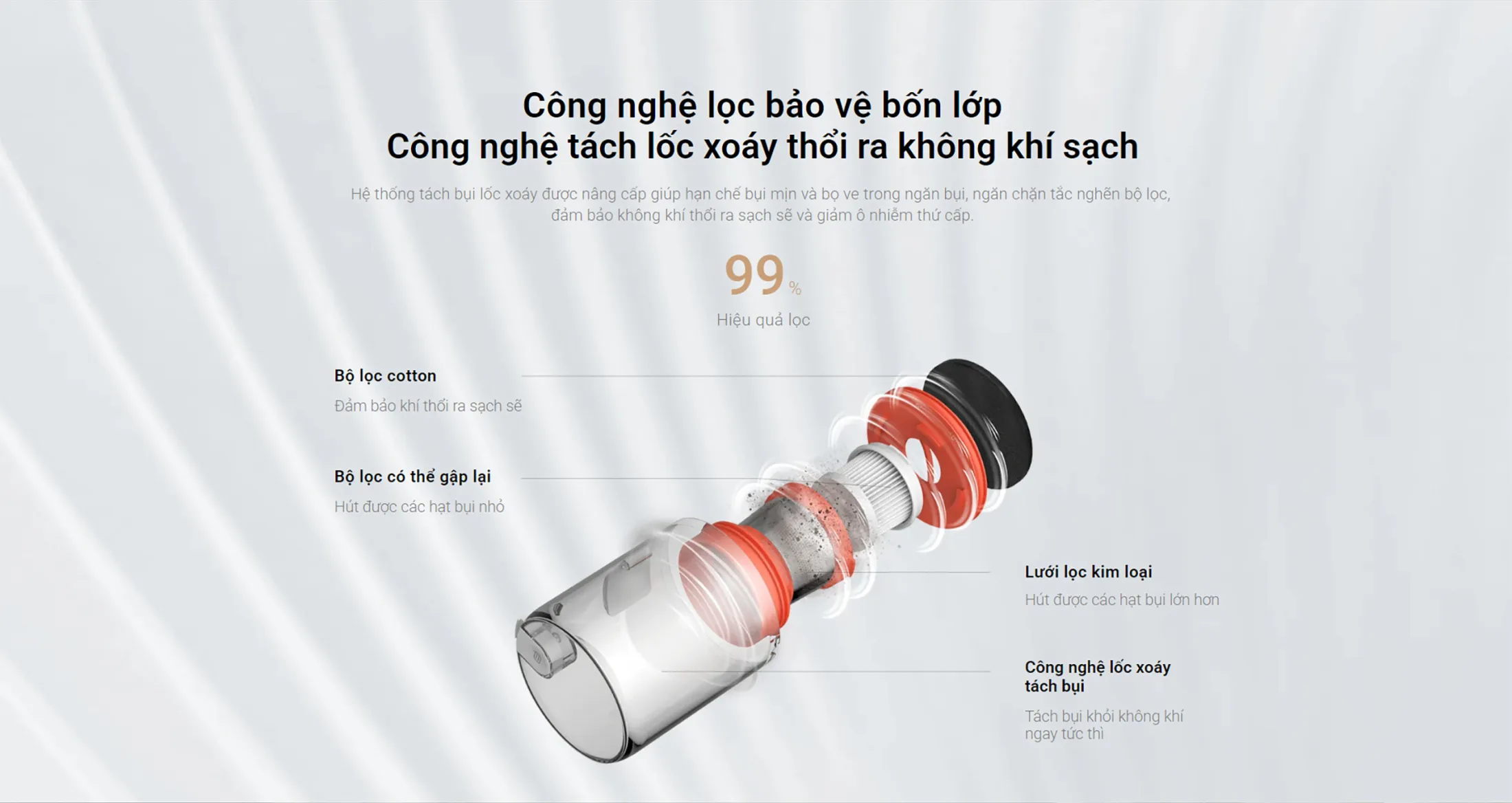 Xiaomi Dust Mite Vacuum tích hợp bộ lọc cotton, lưới kim loại và bộ lọc xoáy mạnh mẽ giúp giảm 99% bụi siêu nhỏ. Thêm vào đó, ngăn chứa bụi được thiết kế thấu kính để bạn dễ dàng kiểm tra mức độ sạch.