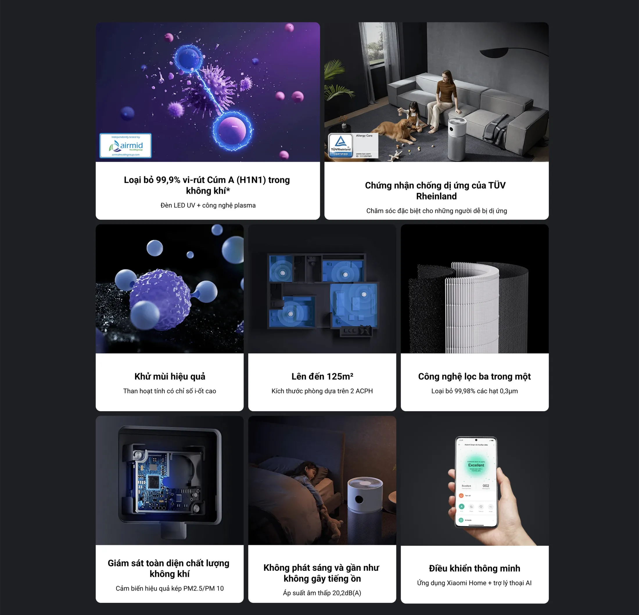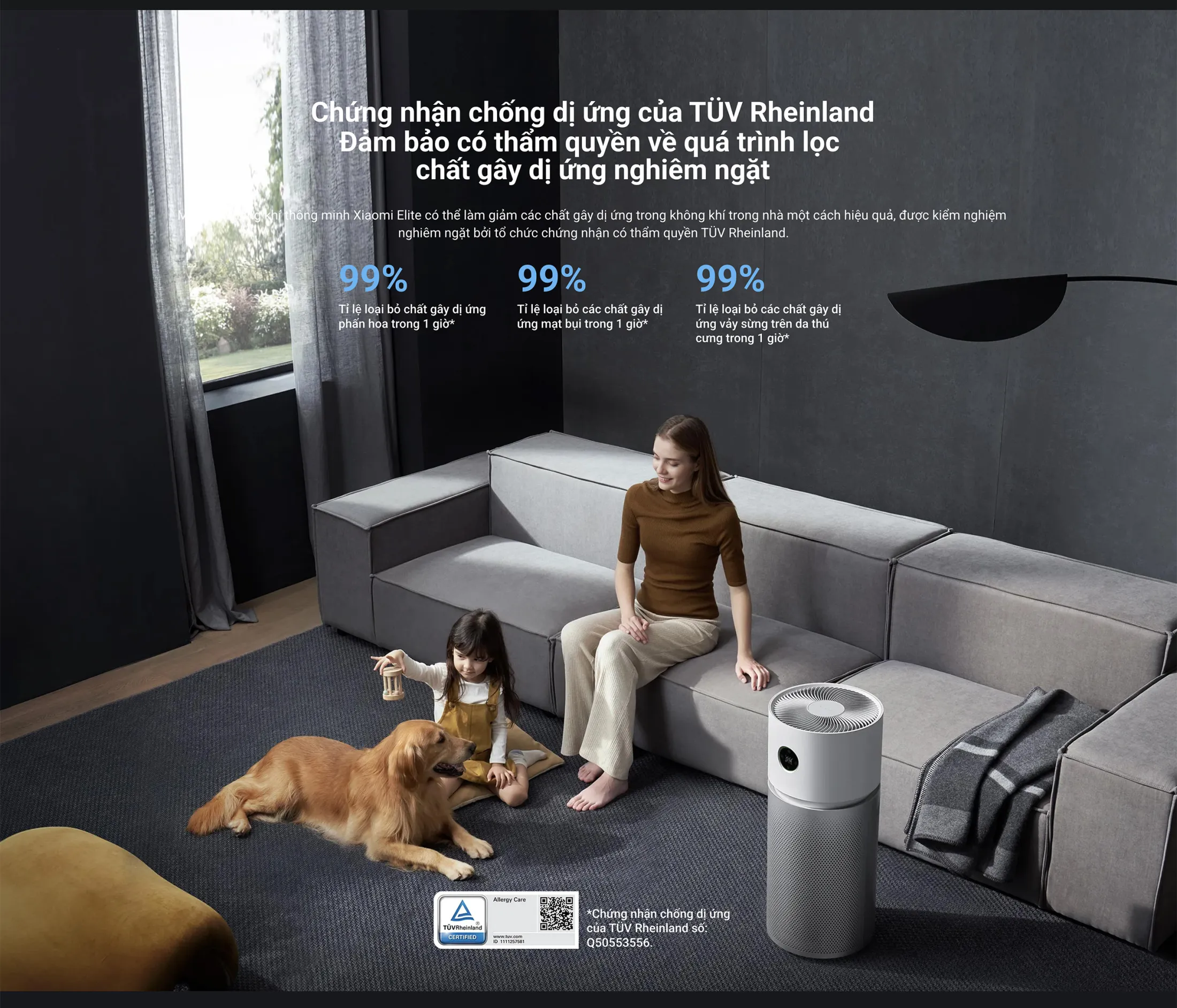 Xiaomi Elite được thiết kế đặc biệt để đáp ứng nhu cầu của những ngôi nhà hiện đại, nơi mọi thành viên – từ trẻ em tới người già – cần một môi trường sống trong lành. Với công nghệ bộ lọc hiệu suất cao và đèn LED UV-C tích hợp, máy có thể loại bỏ 99,9% vi-rút H1N1 chỉ trong vòng 30 phút, đồng thời khử mùi thải, giảm TVOC và bảo vệ những người dễ bị dị ứng nhờ chứng nhận chống dị ứng TÜV Rheinland.