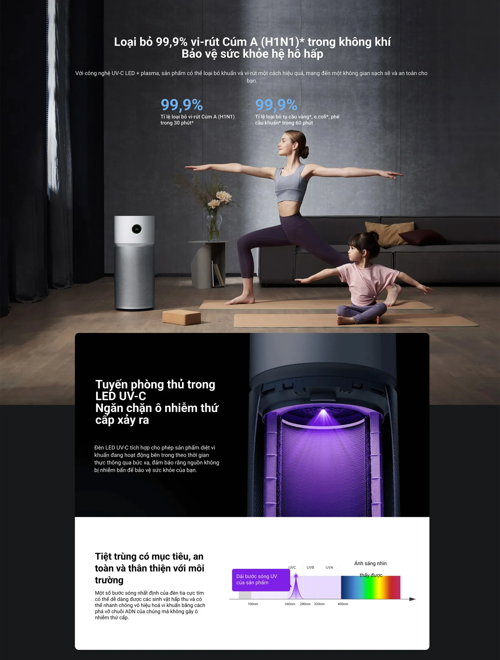 - Khả năng loại bỏ tụ cầu vàng, E. coli và phế cầu khuẩn 99,9% trong 60 phút