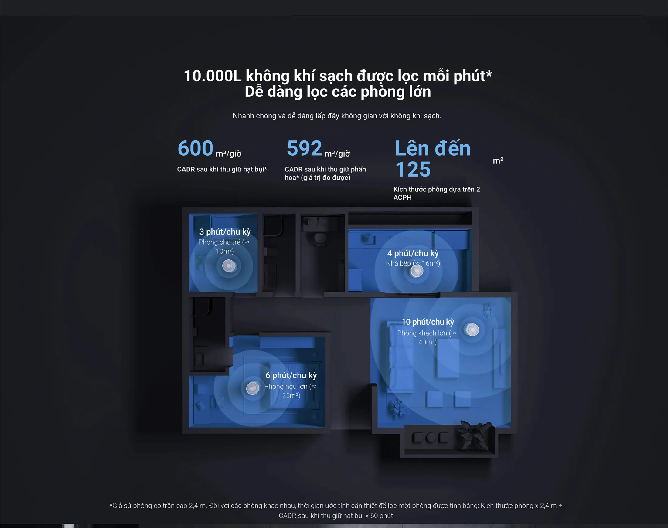 - Khả năng lọc lên tới 125m² trong phòng có trần cao 2,4 m