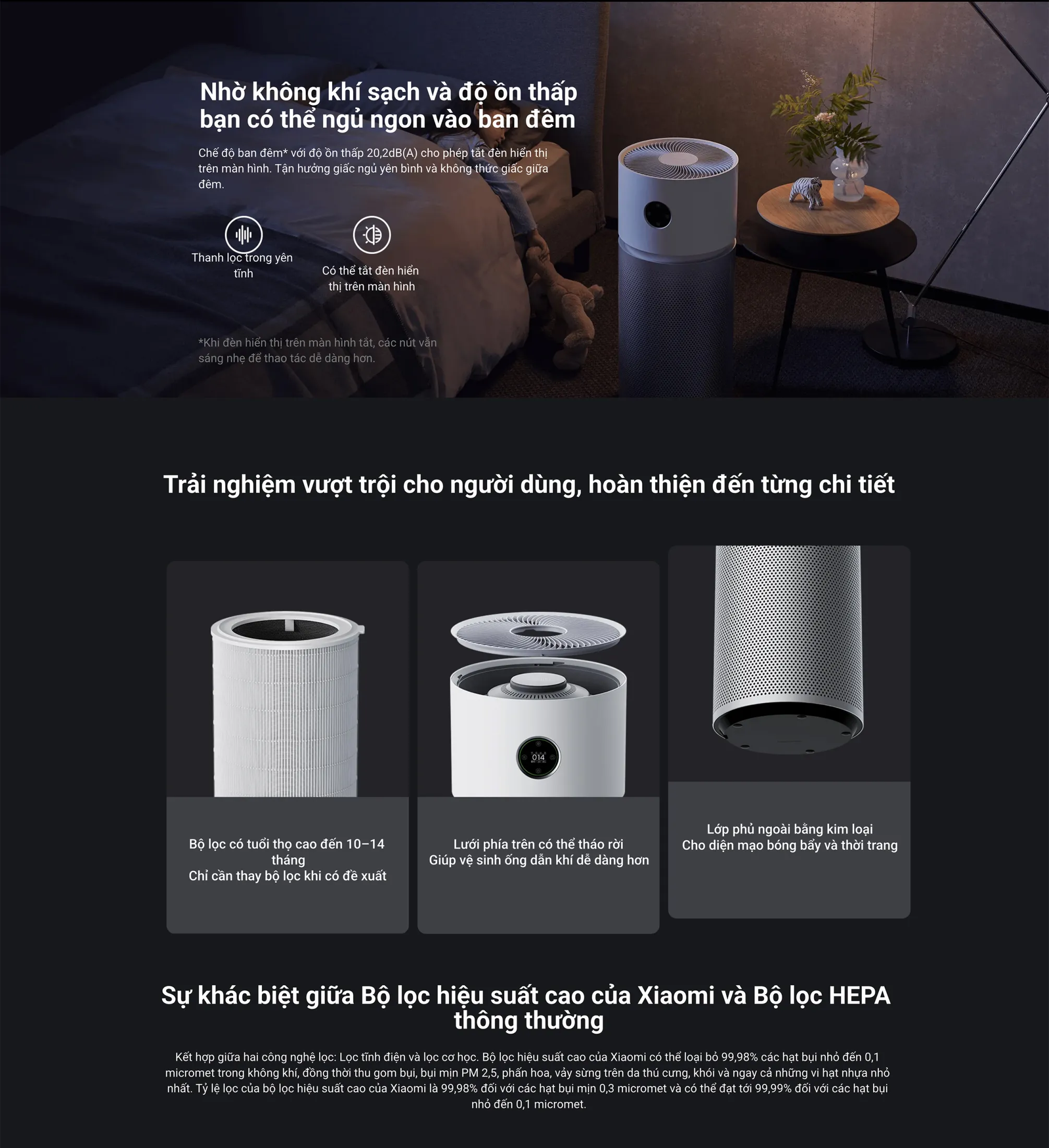 Với thiết kế lưới lọc nhẹ và công nghệ tĩnh điện, Xiaomi Elite tiêu thụ ít điện hơn so với HEPA truyền thống. Tiếng ồn dưới 20 dB(A) giúp bạn ngủ ngon mà không bị gián đoạn bởi tiếng gió của máy.