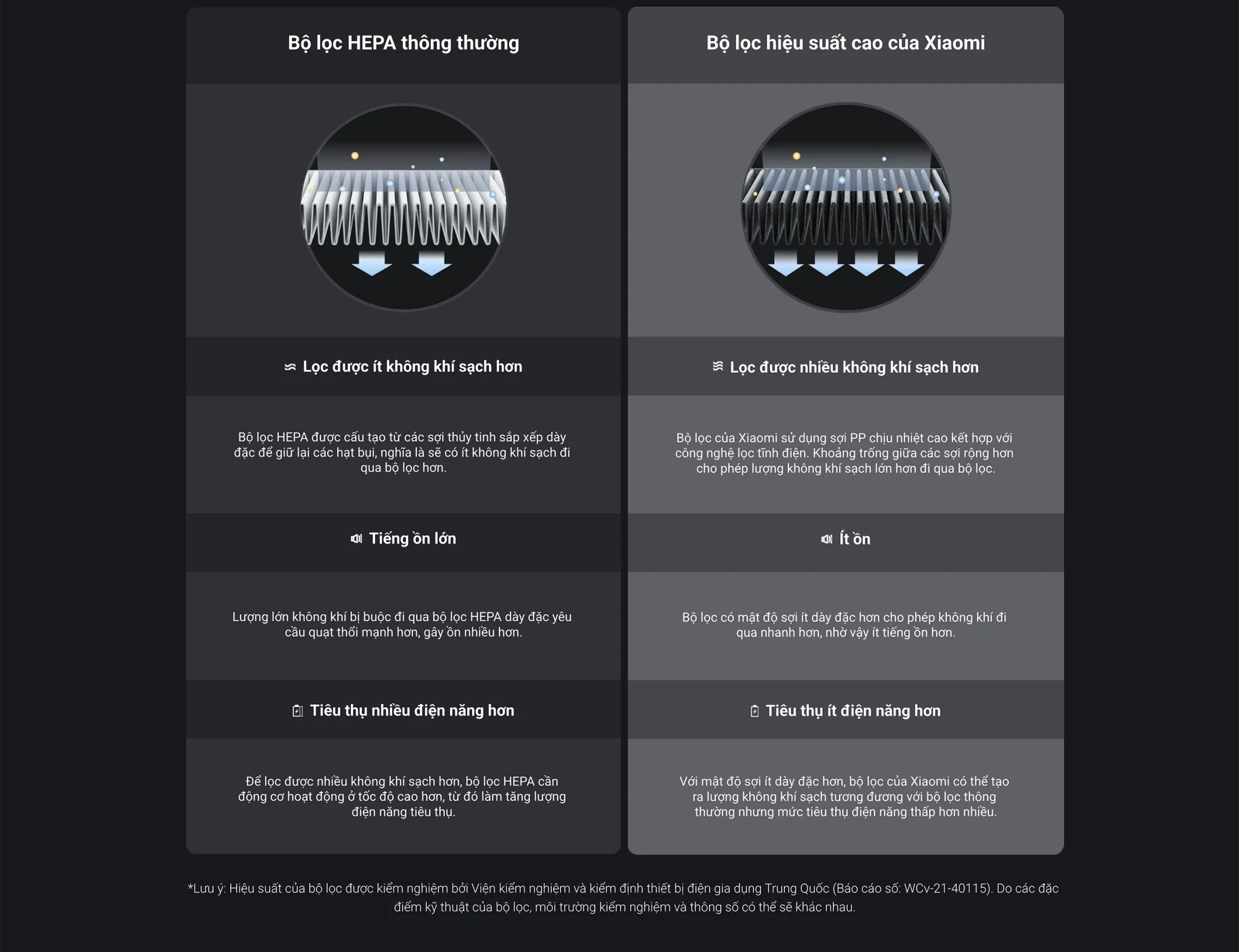 Xiaomi Elite không chỉ dừng lại ở việc sử dụng HEPA thông thường. Bộ lọc hiệu suất cao kết hợp công nghệ tĩnh điện và cơ học để loại bỏ 99,98% các hạt 0,3µm – kích thước nhỏ nhất mà con người có thể hít vào.