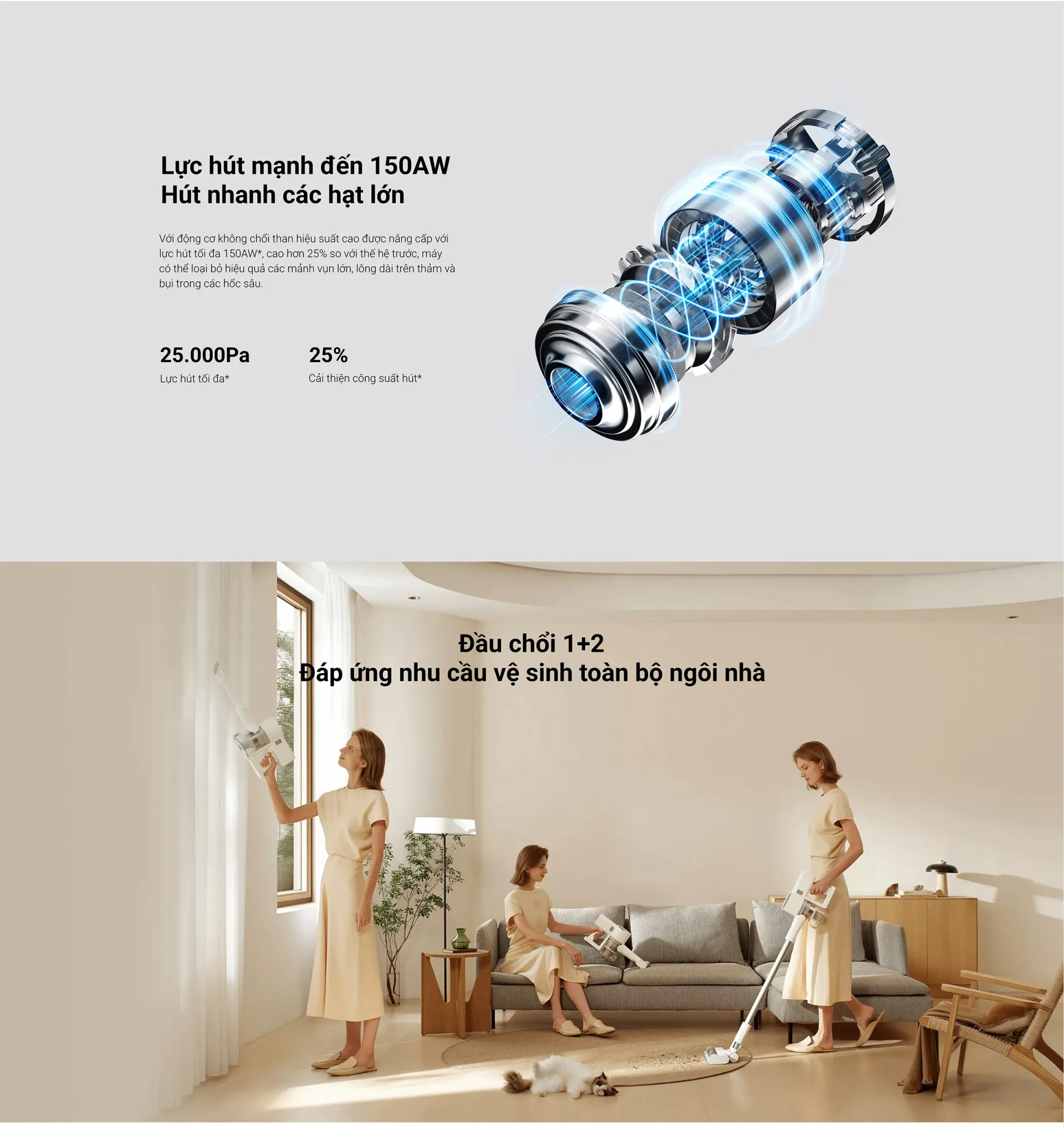 Xiaomi G20 được trang bị động cơ không chổi than với hiệu suất cao, nâng cấp lên lực hút tối đa 150AW, tăng hơn 25% so với thế hệ trước. Điều này giúp máy có thể loại bỏ nhanh các mảnh vụn lớn, lông thú dài trên thảm và bụi sâu trong các khe hở.