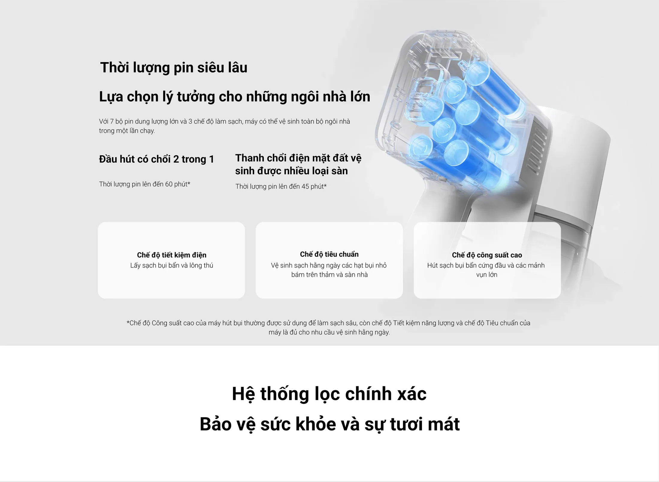 - Chế độ tiết kiệm điện: Hoạt động tối đa 60 phút (đầu hút có chổi) hoặc 45 phút (thanh chổi điện). Thích hợp cho việc dọn dẹp thường xuyên trong toàn ngôi nhà.