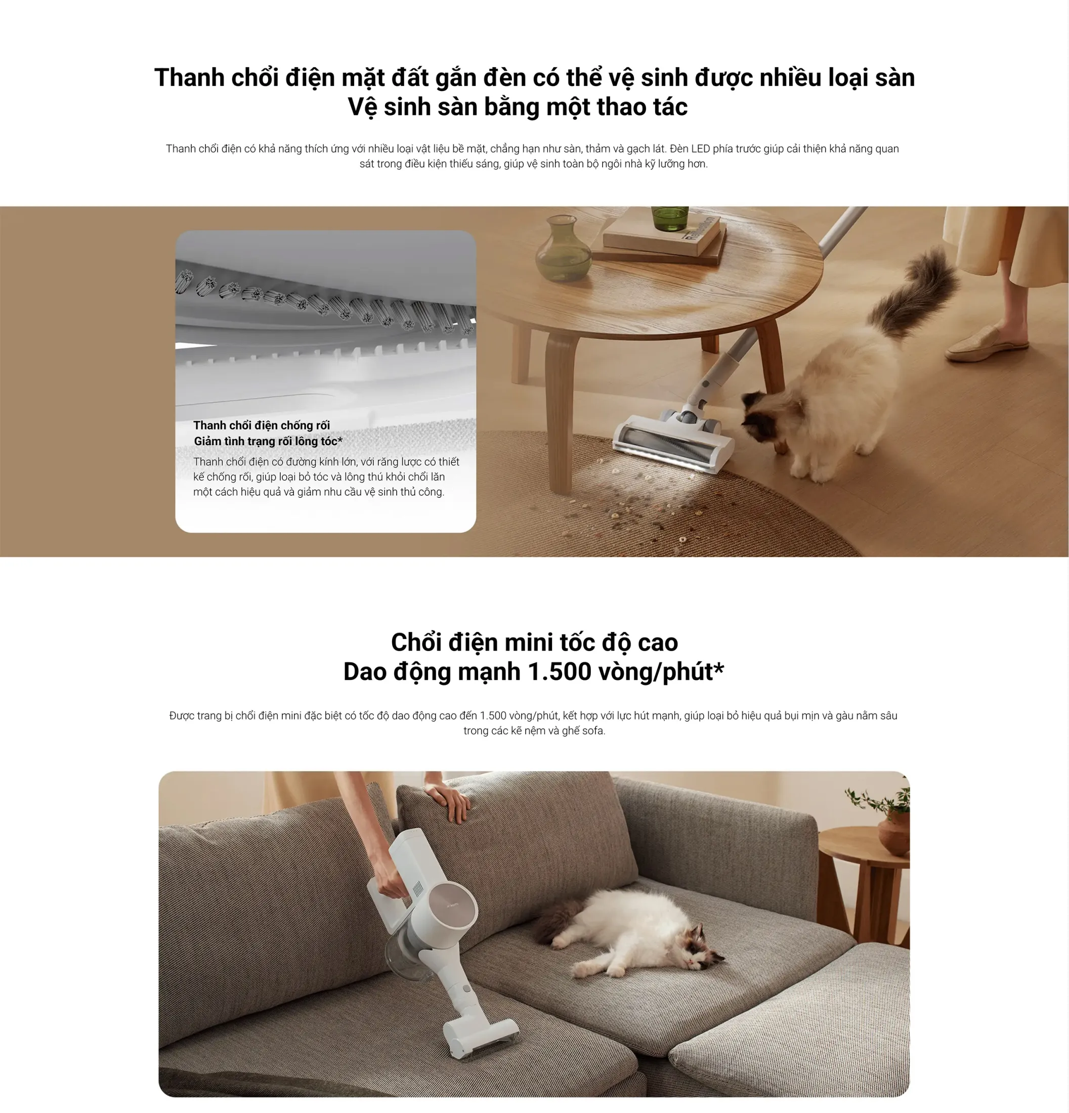 - Thanh chổi điện mặt đất: Khả năng chống rối với thiết kế đường kính lớn và răng lược chống rối, giúp loại bỏ tóc và lông thú một cách hiệu quả. Đèn LED phía trước tăng khả năng quan sát trong điều kiện thiếu sáng.
