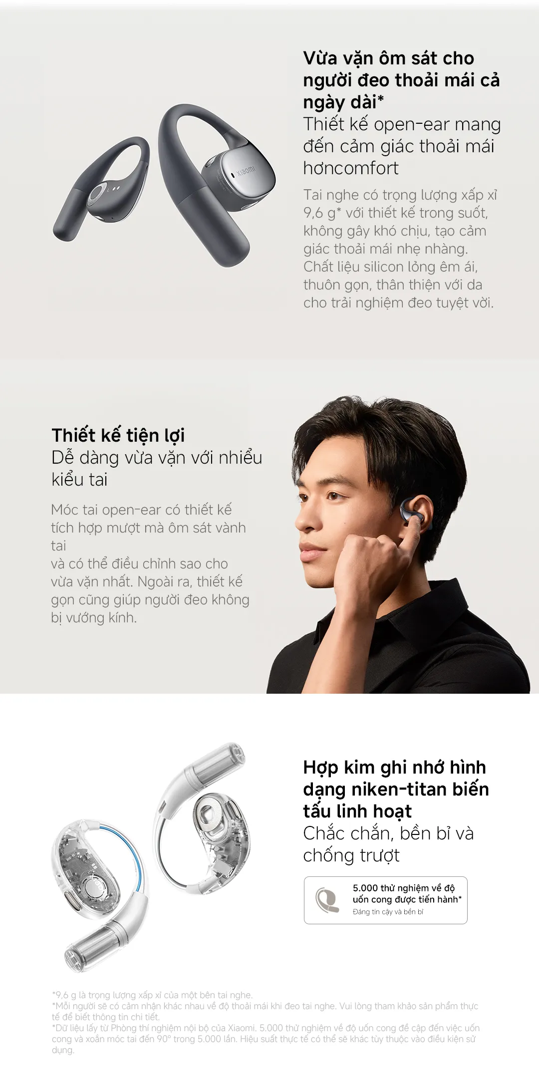 Có trọng lượng xấp xỉ 9,6 g cho mỗi bên tai nghe, Xiaomi OpenWear sở hữu lớp silicon lỏng mềm mại, vừa gắn vào da tai mà vẫn không gây cảm giác nặng nhọc. Thiết kế open‑ear được tối ưu hóa với móc tai tích hợp giúp ôm sát vành tai một cách chắc chắn nhưng vẫn linh hoạt để điều chỉnh tùy theo hình dạng tai.